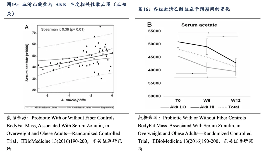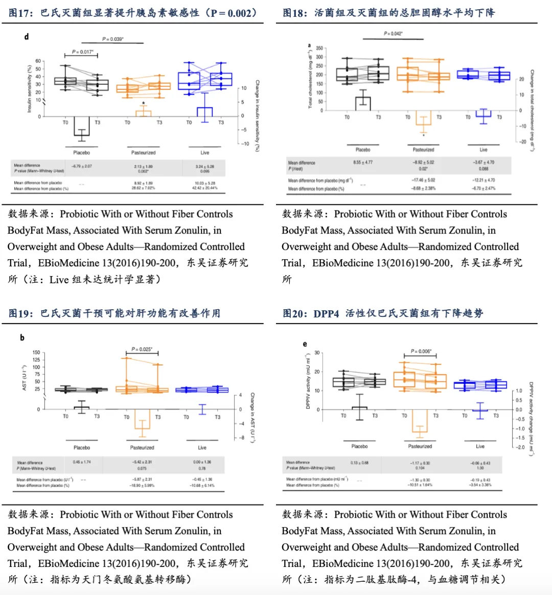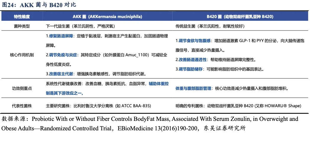 本篇报告通过研读益生菌领域核心期刊的论文,印证分析:(1)肠道菌群失调是导致肥胖的成因之一:①单向移植实验证明了肠道菌群本身是导致肥胖的独立因素(因果性),为基础发现;②共饲实验证明了健康的“瘦菌群”具有竞争优势和治疗潜力。当环境允许时,瘦菌群中的关键细菌可以入侵并改造胖鼠的菌群,从而逆转其致胖趋势;(2)B420菌能够降低能量及脂肪摄入,改善肠道通透性、降低炎症及体脂:B420益生菌通过降低脂肪及能量摄入来降低体脂(提升瘦体重),与益生元配合使用效果更加,6个月为期体脂均降4.5%(组间差值约-1.4kg);同时能够改善肠道通透性(预防肠漏)、减缓炎症;(3)AKK辅助调节食欲、全身炎症及糖脂代谢:AKK能通过降解粘蛋白产生乙酸盐,对促进代谢效果显著,具备更好的胰岛素敏感性、更健康的脂肪分布和肝脏功能,同时高AKK人群在饮食干预中,减肥效果更好。AKK不是孤立存在,而是“有益菌联盟”的一部分,健康的肠道环境是益生菌发挥最大作用的基石;(4)灭活AKK于胰岛素抵抗及改善肠道屏障的效果更佳:经过巴氏杀菌(灭活)的 AKK在预防肥胖、胰岛素抵抗和改善肠道屏障的效果甚至比活菌更好。(5)AKK的补充效果高度依赖于基线肠道中该菌的水平,在基线水平低的患者中AKK能够有效定植并显著改善体重、体脂、血糖等代谢指标;而在基线水平高的患者中定植效率低,且未显示出显著的代谢改善效果,动物实验中也未观察到额外代谢益处。