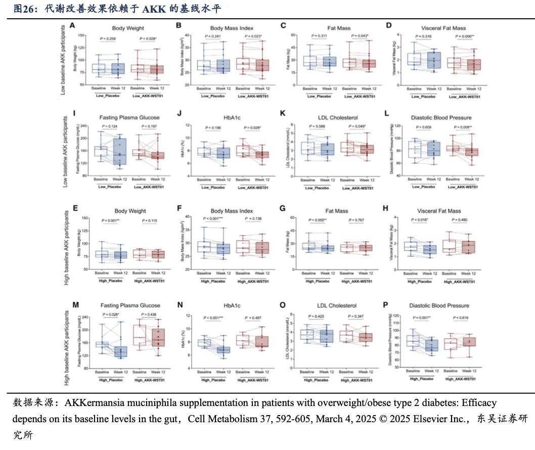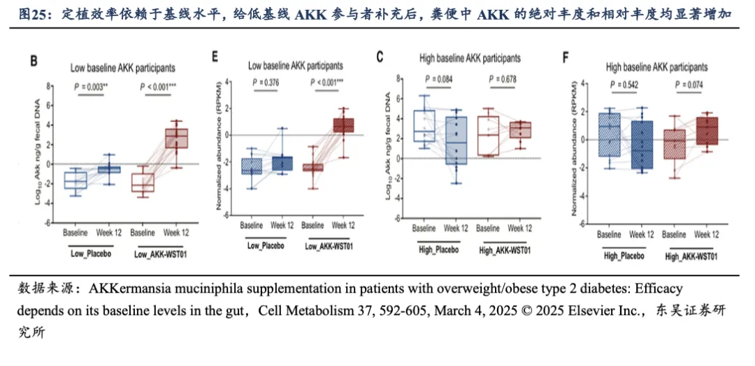 ②而在基线 A. muciniphila 水平高的患者中:AKK-WST01 定植效率低,且未显示出显著的代谢改善效果,动物实验中也未观察到额外代谢益处。