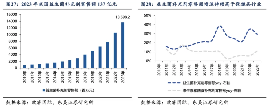 益生菌为百亿长青保健赛道,零售额增速领先于行业。2023年我国益生菌补充剂零售规模约 137 亿元, 2010-2023 年零售额 CAGR=23%, 同期保健品(狭义保健品定义,膳食营养补充剂)零售额 CAGR 仅 9%。