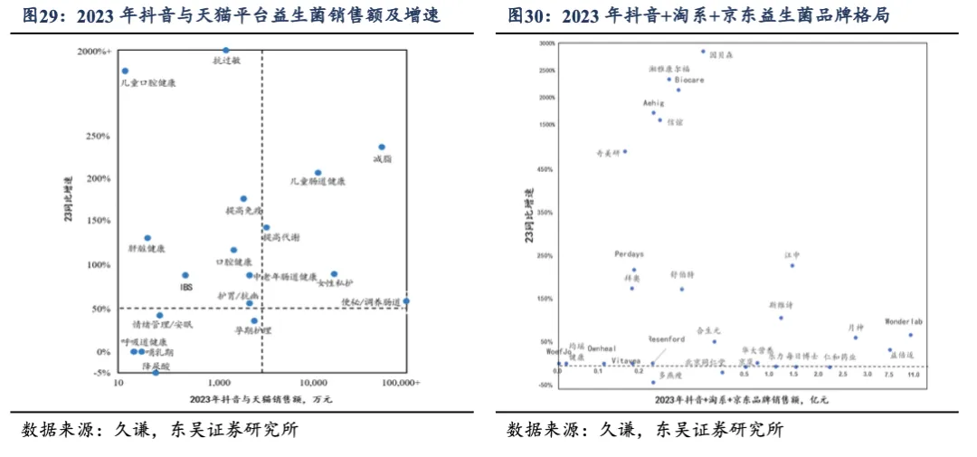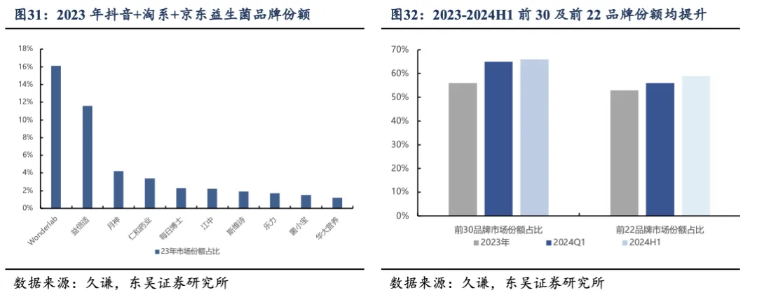 2023 年抖音及淘系、京东平台销售额前三为 wonderlab、life-space 及月神(由广东知合堂生物科技有限公司生产研发,是面向女性的口服益生菌产品)。趋势而言,行业头部集中明确, 对比2023年, 2024H1 前三十品牌/前二十二品牌份额分别提升 10/6pct。