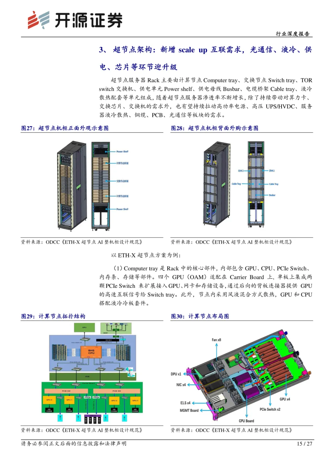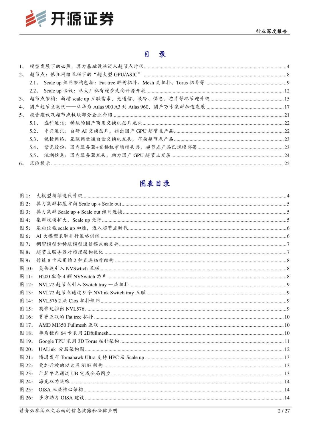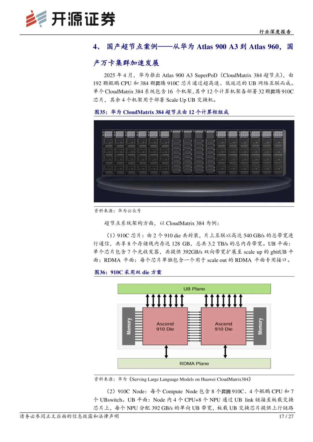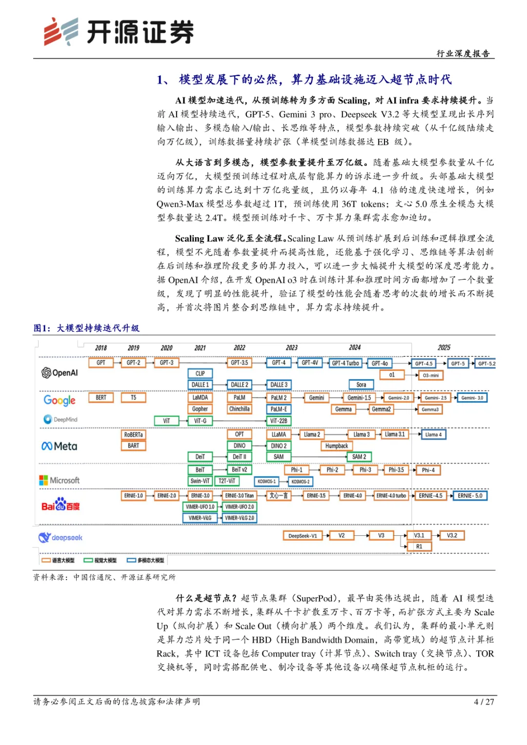 随着 AI 模型向万亿参数迭代,训练与推理对算力的需求呈爆发式增长,算力基础设施迈入超节点时代。超节点由英伟达率先提出,通过 Scale Up 和 Scale Out 双维度扩展,将多个算力芯片整合为逻辑上的 “大型 GPU/ASIC”,突破传统服务器效率与可靠性瓶颈。其架构涵盖计算节点、交换节点等核心单元,带动光通信、液冷、供电、芯片等环节全面升级。国产超节点发展迅猛,华为 Atlas 系列集群通过创新互联技术,有效弥补单卡算力差距,已实现规模部署。超节点产业链长期受益于 AI 算力需求增长,核心投资方向集中在网络端、AIDC、计算端三大主线,光模块、液冷、服务器电源、交换芯片等赛道潜力突出。相关企业凭借技术创新与产品适配,在国产替代与规模扩张中占据优势,推动行业持续升级。