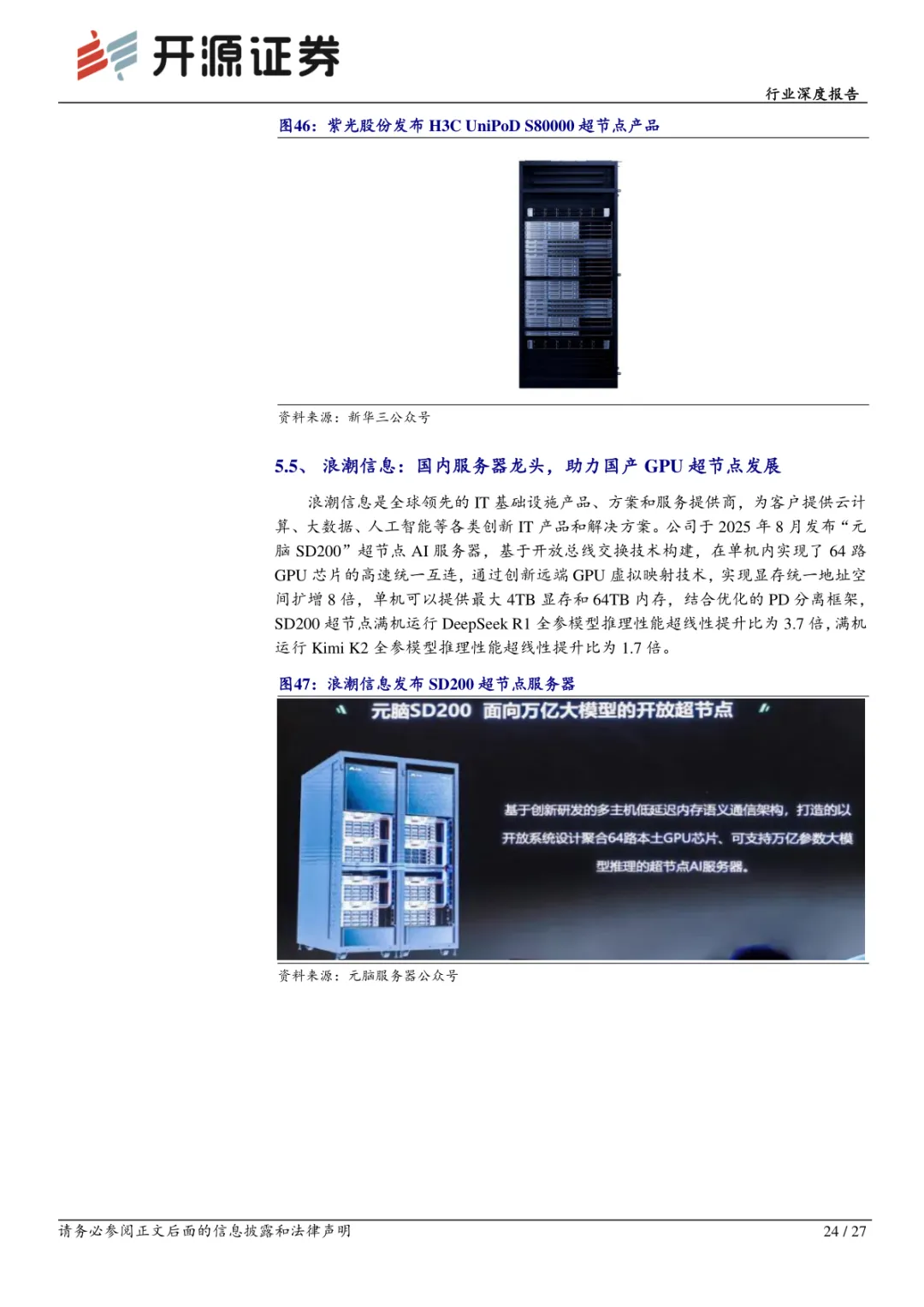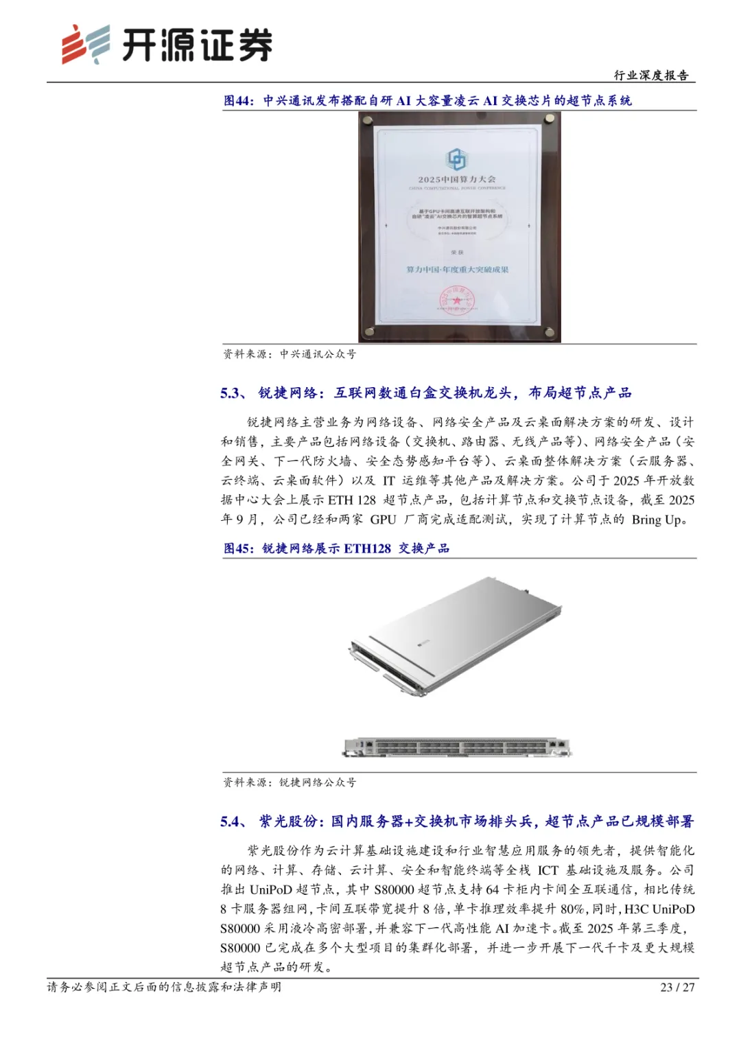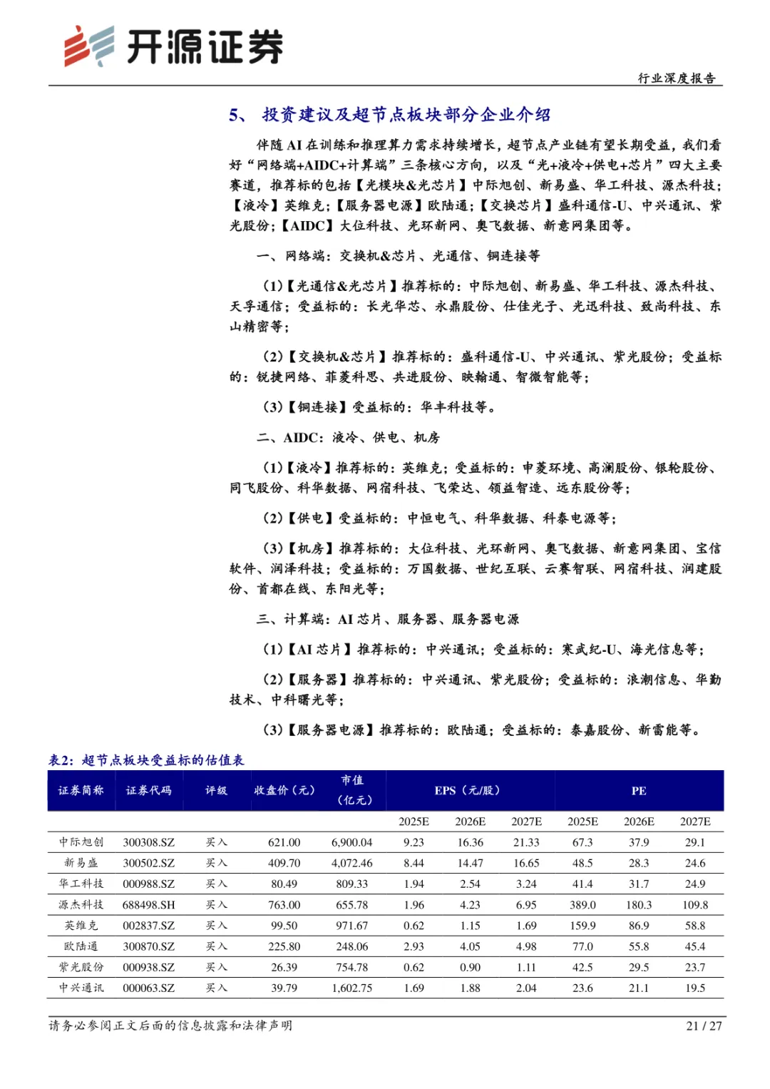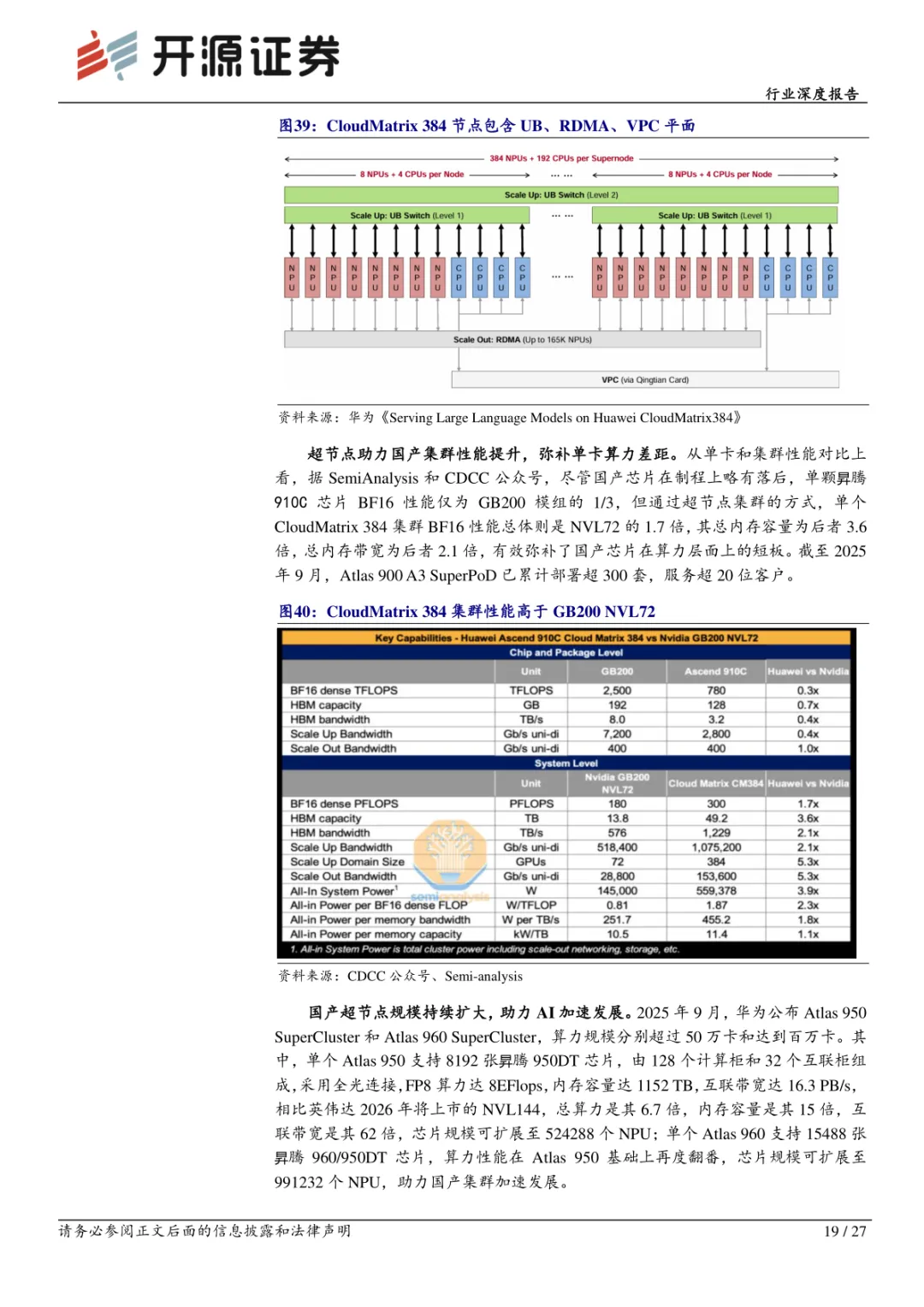 随着 AI 模型向万亿参数迭代,训练与推理对算力的需求呈爆发式增长,算力基础设施迈入超节点时代。超节点由英伟达率先提出,通过 Scale Up 和 Scale Out 双维度扩展,将多个算力芯片整合为逻辑上的 “大型 GPU/ASIC”,突破传统服务器效率与可靠性瓶颈。其架构涵盖计算节点、交换节点等核心单元,带动光通信、液冷、供电、芯片等环节全面升级。国产超节点发展迅猛,华为 Atlas 系列集群通过创新互联技术,有效弥补单卡算力差距,已实现规模部署。超节点产业链长期受益于 AI 算力需求增长,核心投资方向集中在网络端、AIDC、计算端三大主线,光模块、液冷、服务器电源、交换芯片等赛道潜力突出。相关企业凭借技术创新与产品适配,在国产替代与规模扩张中占据优势,推动行业持续升级。