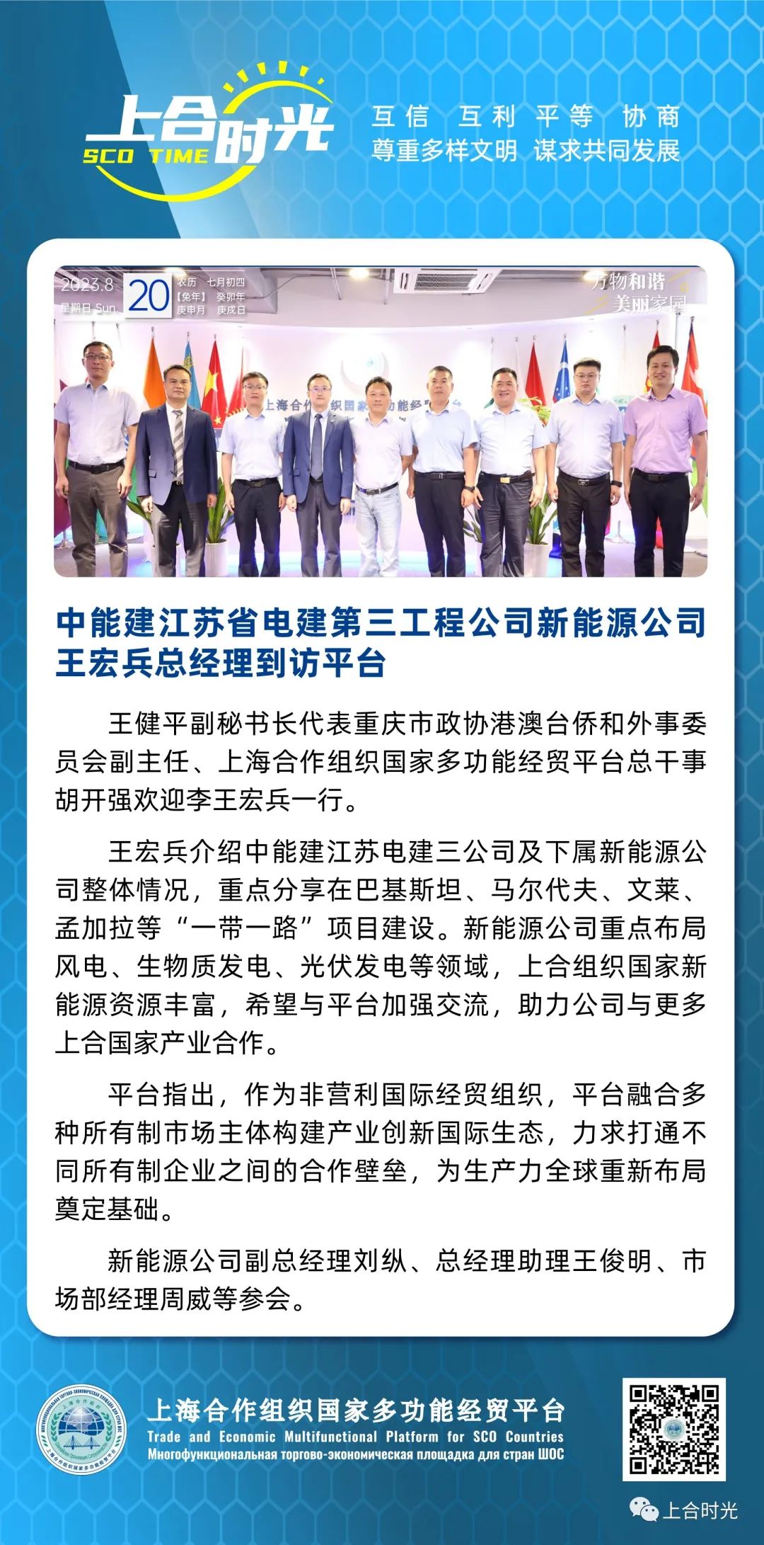 王宏兵介绍中能建江苏电建三公司及下属新能源公司整体情况,重点分享在巴基斯坦、马尔代夫、文莱、孟加拉等“一带一路”项目建设。新能源公司重点布局风电、生物质发电、光伏发电等领域,上合组织国家新能源资源丰富,希望与平台加强交流,助力公司与更多上合国家产业合作。