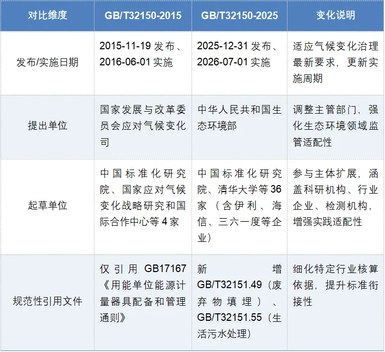 GB/T32150-2025《工业企业温室气体排放核算和报告通则》作为GB/T32150-2015的修订版,于2025年12月31日发布、2026年7月1日实施,在保持核心框架连续性的基础上,针对温室气体核算与报告的新形势、新需求进行了多维度优化。以下从核心结构、关键技术内容、规范性要求三大维度展开详细对比: