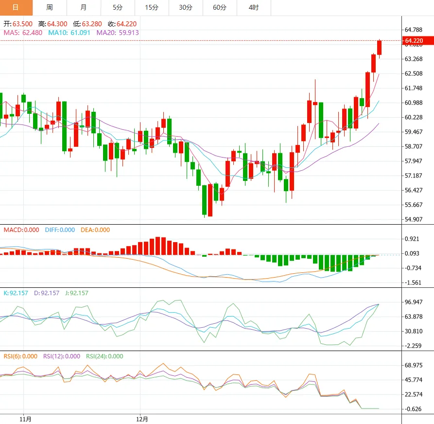 周四亚盘时段,美原油价格延续上涨态势,交投于每桶 63.70 美元附近。近期,国际原油市场表现显著走强,WTI 原油价格一度攀升至四个月以来的高点。此番走强的核心驱动力,主要源于地缘政治局势的再度紧张,风险溢价重新成为市场定价的关键因素。