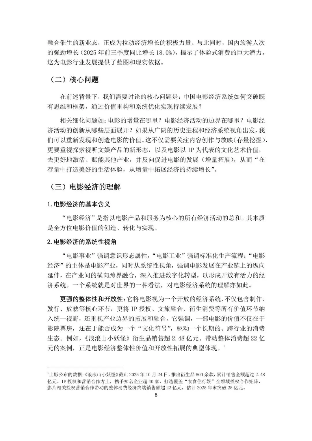 电影经济、产业结构(制片、发行、放映、衍生)、政策支持、技术创新(AI、VR)、市场主体(行业巨头 + 特别势力)、区域布局、产业融合(电影 + 文旅 / 科技)、全球南方国家电影