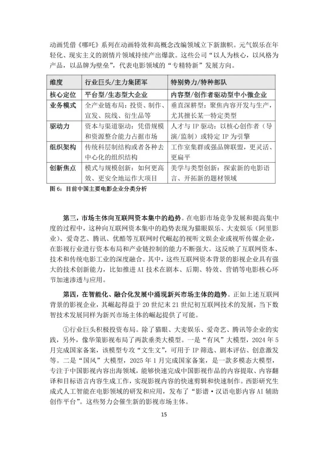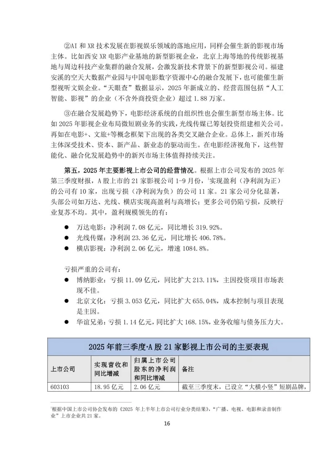市场主体分化显著,形成 “巨头 + 特种部队” 双轨格局。行业巨头(中影、光线、猫眼等)全产业链布局,搭建产业基础设施;“特别势力”(坏猴子、追光动画等)深耕垂直赛道,聚焦类型创新与作者性表达。互联网资本持续集中,AI 技术推动新兴主体涌现,2025 年新成立 “AI + 影视” 企业超 1.88 万家,上市公司分化明显,头部盈利高增与中小企亏损并存。 供需结构深度调整,观众与影片类型呈现新特征。影片供给总量下降(2025 年公映 578 部),但虚拟现实电影崛起(备案 109 部);观众基数约 5 亿,30-39 岁占比达 40%,24 岁以下占比降至 15%,“剧情 +”(剧情 + 喜剧 / 犯罪等)成为主流类型,合家欢、强情节现实主义、重工业视效三大配方受青睐,满意度达 86.0 分,但高满意度影片数量不足。 政策体系覆盖全链条,“电影 +” 融合成核心导向。全国性政策聚焦消费惠民(观影补贴)、业态丰富(“跟着电影去旅游 / 品美食 / 做科普”)、开放合作(中外合拍)、技术创新(VR 电影、LED 影厅)、拥军爱国;地方性政策呈现 “强区全链条协同、弱区点状激励” 特征,微短剧、科幻题材、文旅融合成为扶持重点,资金支持上限可达 2000 万元。 技术创新驱动产业升级,数智化重塑全流程。AI 广泛应用于剧本评估、特效制作、精准营销,华策 “有风”“国风” 大模型落地;虚拟拍摄、VR 电影普及,《刺杀小说家 2》虚拟制片占比 70%,效率提升超 70%;影院向 “综合娱乐空间” 转型,XR 体验、电竞直播等非票业务成为增长引擎,《浪浪山小妖怪》衍生品收入超 2.48 亿元,带动整体消费超 22 亿元。 产业布局区域协同,国际交流与融合创新深化。票房产出呈 “金字塔格局”,广东、江苏等 7 省市贡献近半票房;影视基地形成京冀鲁、长三角、大湾区、川渝四大核心区域;六大电影节通过 “电影 + 文旅”“电影 + 消费” 撬动经济增量;海外发行稳步推进,2025 年国产电影海外票房超 10 亿元,全球南方国家电影(亚洲、非洲、拉美)成为国际交流新亮点。