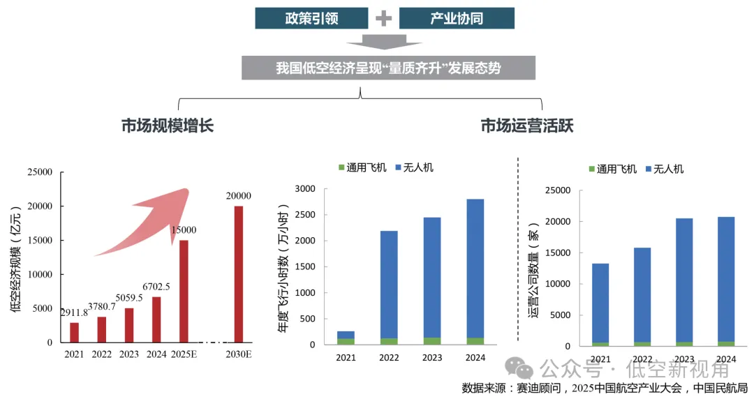2025年,我国低空经济通过持续深化政策引领与产业协同,在空域管理精细化、运行标准体系化、基础设施网络化等方面取得突破性进展,核心技术攻关与商业模式创新取得实效,呈现“量质齐升”的发展态势。从装备端看,民用无人机与eVTOL(电动垂直起降航空器)作为我国低空经济发展的重要支撑与前沿赛道,产业规模持续扩大。根据中商产业研究院数据,2025年我国民用无人机市场规模预计达1277.86亿元,同比增长15%。其中工业级无人机主导地位愈加凸显,市场规模为775.66亿元,占比首次突破60%。eVTOL市场进入商业化探索初期。根据公开数据整理,截至2025年11月,我国eVTOL年度订单总额已超过300亿元,其中海外订单占据主要份额。从应用端看,我国低空飞行市场持续活跃。根据中国航空运输协会数据,截至2025年7月,我国有人机运营企业达801家,无人机运营企业数量突破1.99万家,行业参与度持续提升。2025年上半年,无人机飞行时间达2447万小时,市场需求高速增长。