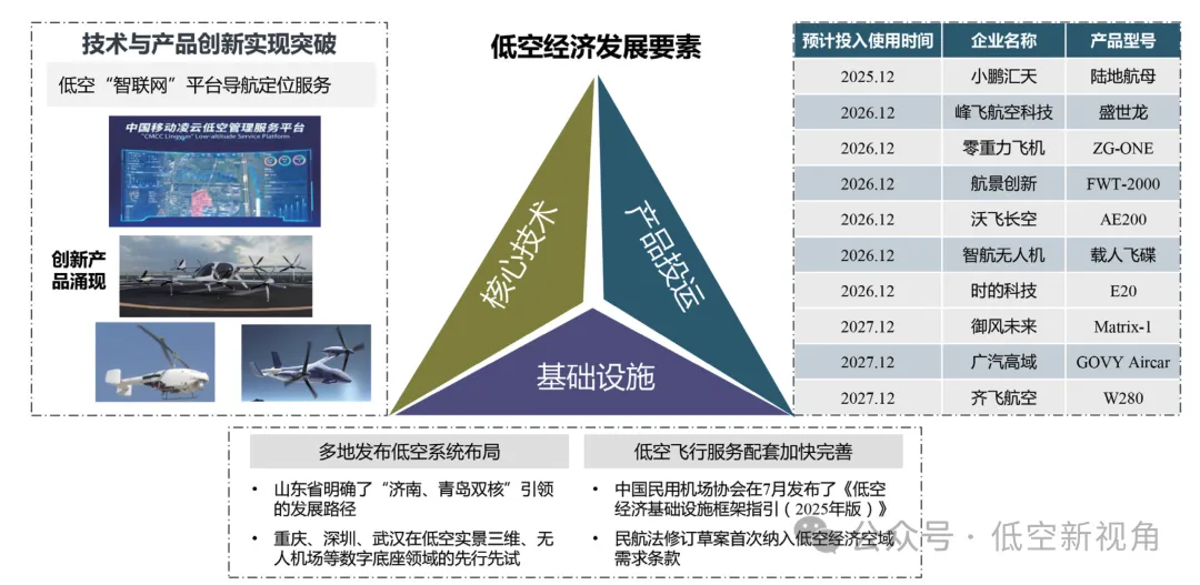低空技术与装备创新将开启从试点验证到商业化探索的关键过渡。在低空智联网的构建上,将加紧突破通感一体、全域感知与安全管控等关键技术难题,通过融合5G-A、ADS-B、卫星等新一代信息技术,构建覆盖更全、可靠性更高的低空感知网络与统一管控平台,以应对高密度、大频次、复杂化的低空运行态势。在低空装备领域,发展重点将从样机试飞验证转向适航取证、规模化量产与商业模式的落地。继亿航智能率先实现“TC+PC+AC+OC”四证齐全后,预计2026年将有更多eVTOL机型进入适航审定的关键阶段。峰飞航空、沃飞长空等多家企业均宣布计划在2026年取证投入试点,为商业化应用积累必要数据和实践经验。