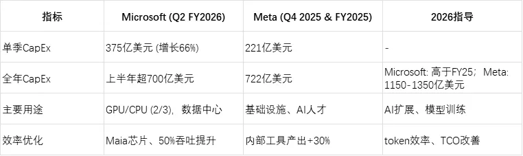 AI基础设施投入:Meta和微软均大幅增加资本支出,以支持AI发展,但Meta的2026年指导显示更激进的增长(1150-1350亿美元,较2025年72亿美元增长近一倍),而微软FY2026整体支出预计高于FY25,Q2已达375亿美元,增长66%。研究表明,这种投资正逐步转化为效率提升,但短期内可能压缩利润率。