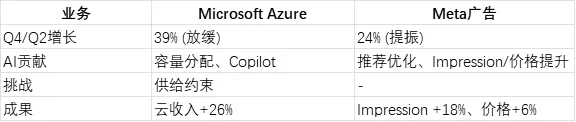 核心业务表现:微软Azure增长放缓至39%,反映供给约束和竞争压力;相比之下,Meta的广告收入受益于AI推荐算法优化,Q4增长24%,显示AI在消费端应用的更直接回报。