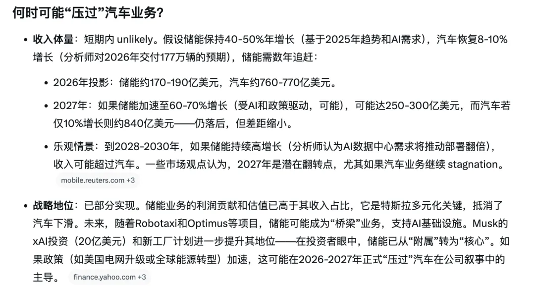 忙碌的早晨还是抽时间听了财报电话会议,不知不觉时间又来到了下午。你如果只用卖了多少辆车来判断特斯拉,这份 2025 年的财报可能会让你感到焦虑。未来的路线图的时间看特斯拉,这是特斯拉十多年来,方向最清晰、决心最彻底的一次转身。2026 年 1 月 28 日,埃隆·马斯克公布了 2025 年第四季度及全年业绩。在数字上,这是一次明显的降速;但在结构上,却是特斯拉从电动车制造商向物理世界 AI 巨头跨越的关键时刻营收: 948.3 亿美元(同比 -3%),这是上市以来首次年度营收下滑。造成下滑的原因并不神秘:全球补贴退坡、中美欧市场竞争内卷、以及关税壁垒对成本结构的冲击。如果特斯拉仍然只是一家卖车的公司,这确实是一个危险信号。但市场的诡异之处在于,尽管销量下滑, 特斯拉的股价逻辑却并未崩塌 。原因在于,特斯拉提前构建的第二增长曲线,五年之久终于不再是 PPT 里的概念。在汽车业务承压的 2025 年,特斯拉的能源部门交出了一份堪称炸裂的成绩单,成为了稳定现金流的定海神针。营收飙升: 全年收入 127.7 亿美元(同比 +27%),占总营收比例已升至 13.5%。部署狂奔: 全年部署 46.7 GWh(同比 +49%),Q4 单季创下 14.2 GWh 的历史新高。Powerwall: 全球安装量突破 100 万套,通过虚拟电厂(VPP)系统,每年为用户节省超 10 亿美元。Megapack: 在公用事业级项目占据主导,随着加州、上海、德州三地工厂扩产,2026 年产能将突破 100 GWh。我的解读: 特斯拉已经深度介入了全球电网效率的重构。这类业务周期长、可预期性强,不像卖车那样受消费情绪波动影响。它正在为特斯拉这一庞大的 AI 实验提供最稳固的后勤补给。「你认为需要多久特斯拉的储能业务才能超越造车业务成为一哥?」毛利率回升: Q4 整体毛利率达到 20.1% (多年新高),汽车业务毛利率(扣除信用)也回升至 17.9%。真实盈利: 尽管 GAAP 净利润受比特币减值等一次性因素影响下跌,但调整后的 EPS ($0.50) 依然击败市场预期。这说明特斯拉并不是在烧钱讲故事,而是在主动收缩低效增长,通过极致的成本控制,为通过资本支出密集的 2026 年积攒弹药。这是本次财报我认为最核心的信号。不再强调年产几百万辆车,而是正式将公司定位切换为 Physical World AI 。这种切换体现在三个激进的战略动作上:特斯拉宣布 Model S 和 Model X 将在 2026 年 Q2 正式停产 。生产要素的置换,弗里蒙特的产线将被腾空,转而用于生产年产 100 万台的 Optimus 人形机器人 。FSD: 订阅用户达到 110 万(增长 40%)。自 2026 年 2 月 14 日起,FSD 全面转为纯订阅制。Robotaxi: 奥斯汀的无监督服务区域扩大了 10 倍,无方向盘的 Cybercab 确认将于今年 4 月投产。这意味着,特斯拉终于要把“软件收入”推向舞台中央,与硬件收入平起平坐。2026 年的资本支出(CapEx)将超过 200 亿美元 。这些钱将流向 AI 算力集群、六条新生产线以及对 xAI 的战略投资。管理层没有画饼,而是给出了极其冷静的预期: 2026 年,可能是车辆销量持平甚至下滑的一年,且面临超过 5 亿美元的关税冲击。对于寻求短期确定性的投资者来说,这会是难熬的一年。但对于科技信徒而言,逻辑非常清晰:新引擎(AI & 能源): 正在点火,准备接管增长曲线。如果你关心的是能源系统如何被软件化,AI 如何从屏幕走向现实世界,以及一家巨头敢不敢在增长放缓时主动革自己的命,那么这份财报就是最好的答案。特斯拉正在豪赌下一个十年,赌注是 440 亿现金和整个汽车帝国的底蕴。 这究竟会带来下一次工业级跃迁,还是一次代价高昂的冒险?答案不会很快揭晓,但方向已不可逆转。你怎么看特斯拉停产 Model S/X 全力押注机器人的决定?欢迎在评论区留下你的看法。
