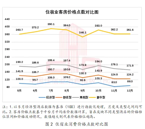 12月平均房价指数为90.9,较11月环比小幅上涨1.3%。年末商务及会展市场仍较为活跃,催生一部分有效住宿需求,平均房价未出现断崖式下滑。经济型、舒适型、高档型、豪华型酒店12月客房价格点数环比总体稳定,其中经济型酒店客房价格点数上涨较为明显,环比增长6.4%。具体数据如图2所示。
