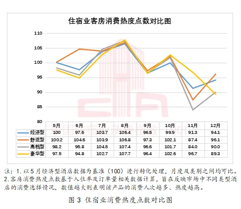 为进一步反映不同类型酒店消费热度变动情况,绘制住宿业客房消费热度点数对比图(见图3)。数据显示,12月不同类型酒店客房消费热度出现分化情况,经济型、舒适型和高档型有所上涨,环比11月分别增长3.1%、10%和7.1%;豪华型有所回落,环比下降7.7%。