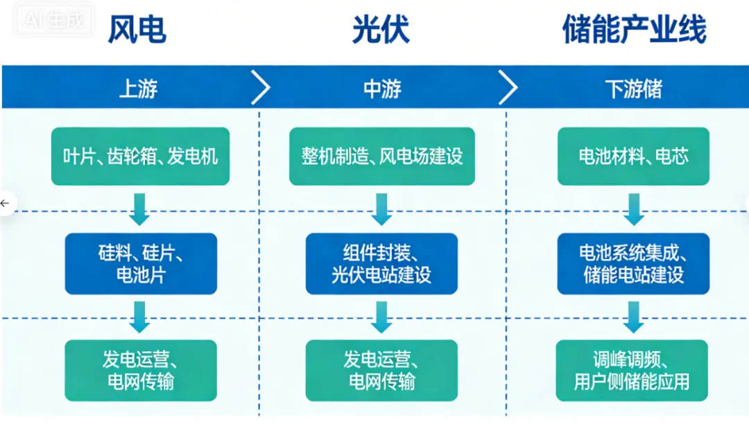 下游应用环节:降低电站建设、运维企业的融资成本,加速新能源电站的投资与并网,推动风电、光伏发电量占比提升。同时,支持新能源与传统能源的协同运行,如风光储氢一体化项目,拓展新能源的应用场景。