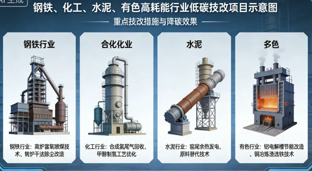 钢铁行业 | 高炉余热回收改造、转炉煤气资源化利用、短流程炼钢技改、绿电替代项目。 | 从长流程炼钢向短流程炼钢转型,推广氢冶金、富氧燃烧技术,提升绿电使用比例。 | 单个技改项目年均减排二氧化碳500-1000万吨,行业碳排放强度有望下降15%-20%。 | 年均资金需求超800亿元,可撬动社会资金超2000亿元。 |
