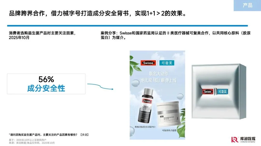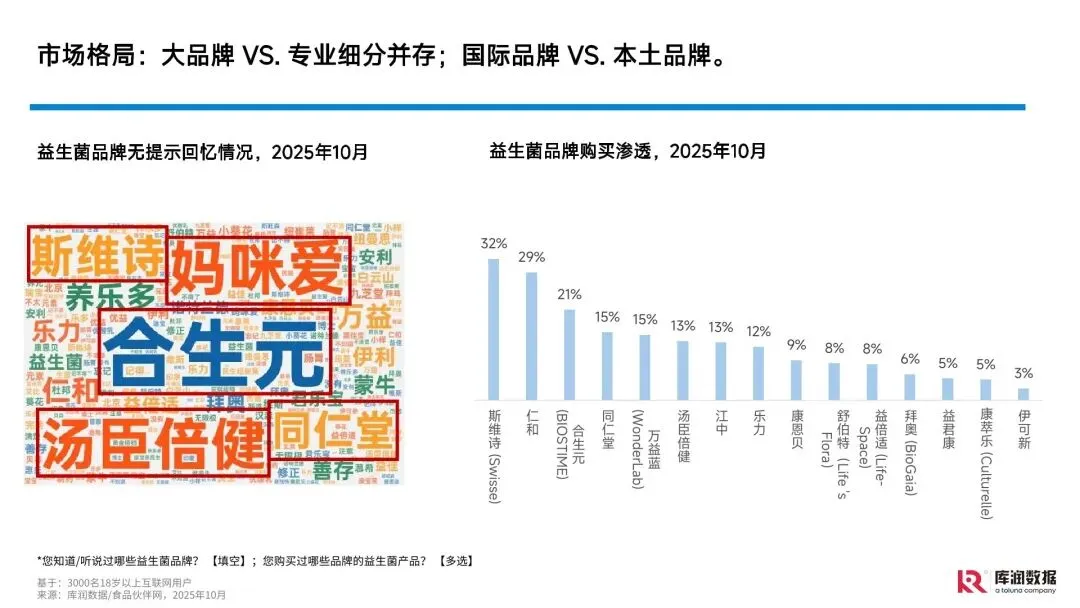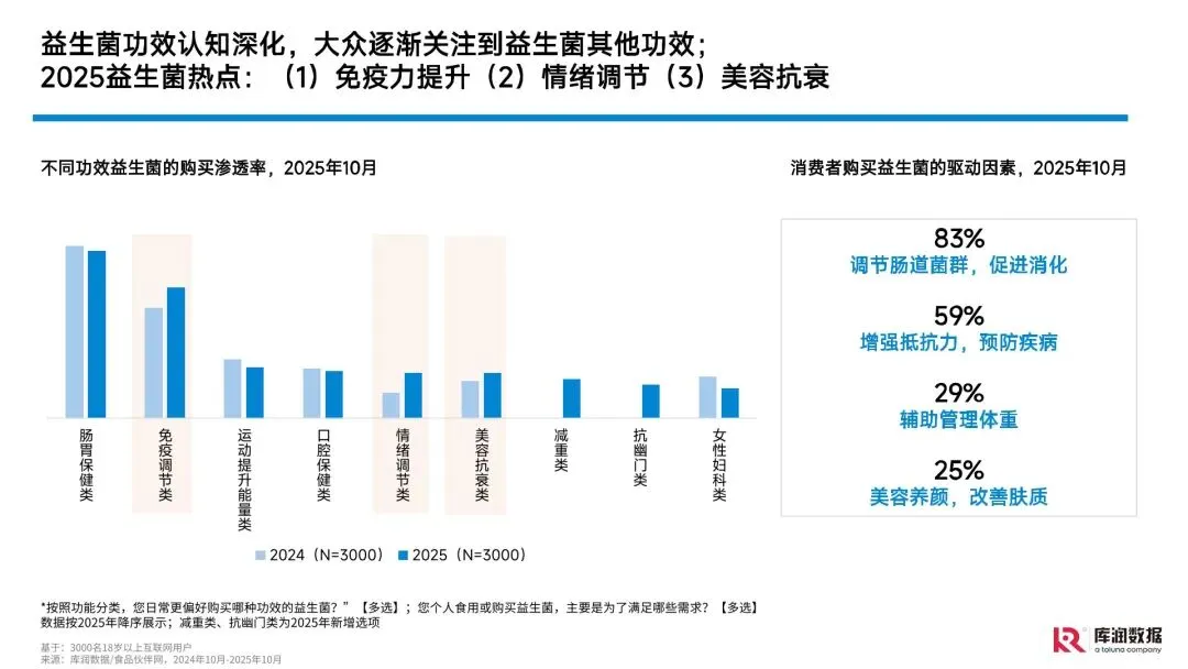 核心消费人群画像清晰,聚焦高线城市已婚已育中产女性。该群体平均年龄 34.9 岁,平均月收入 12453.1 元,65% 为自身购买,35% 为家人(孩子、老人)购置,且超八成会为排解健康困扰消费,一人食外卖、线下烟火气消费、网购是主要消费场景,消费决策兼具个人健康与家庭责任双重导向。 健康痛点集中于免疫力、睡眠与疲劳,后疫情时代需求凸显。中国人群免疫力轻度低下比例超 50%,儿童因 “免疫遗忘效应” 易患呼吸道疾病;77.8% 的消费者存在睡眠问题,职场与家庭高压导致的 “应激性免疫功能紊乱” 成为普遍困扰,直接推动益生菌的健康需求升级。 功效认知从基础肠胃调理向多元场景延伸,三大热点成增长核心。传统肠胃保健仍占基础认知(83% 消费者关注肠道调节),但免疫提升、情绪调节、美容抗衰三大功效增速显著,临床研究证实益生菌可通过肠 - 脑轴、肠 - 皮轴等机制实现对应功效,相关针对性产品(如情绪益生菌、净颜益生菌)成为市场新宠。 市场呈现 “大品牌稳盘 + 专业品牌增量” 格局,中外品牌竞争激烈。无提示回忆与购买渗透中,康萃乐、益倍适、汤臣倍健等国际与本土头部品牌占据优势,同时专业品牌通过细分赛道突围;消费者选购时优先关注功效(58%)、成分安全(56%)与菌株种类(42%),科学依据与临床数据成为品牌信任背书关键。 产品与营销创新聚焦体验升级,全渠道协同成趋势。产品端向功效复合化(如 “肠道 + 免疫 + 钙吸收” 多效合一)、形态多元化(软糖、口服液、固体饮料等)、口味天然化(低糖无糖、天然果蔬调味)发展;营销端以电商为基础、社媒与直播为增量,通过 “可视化沟通”“参与式互动”(如 14 天补菌打卡)、线上线下全渠道覆盖提升用户粘性与转化。