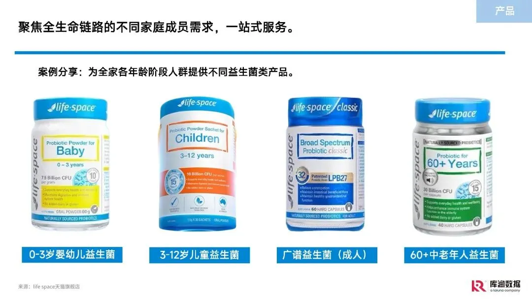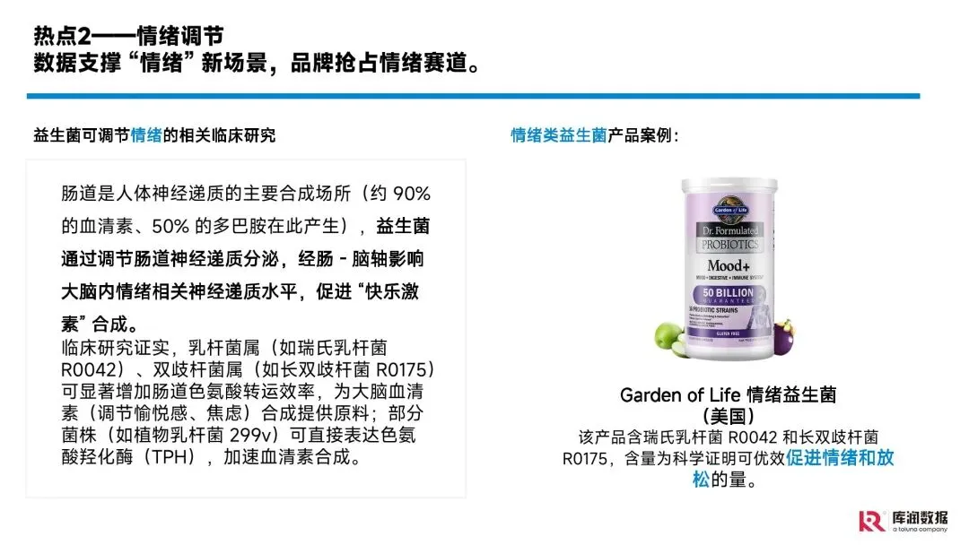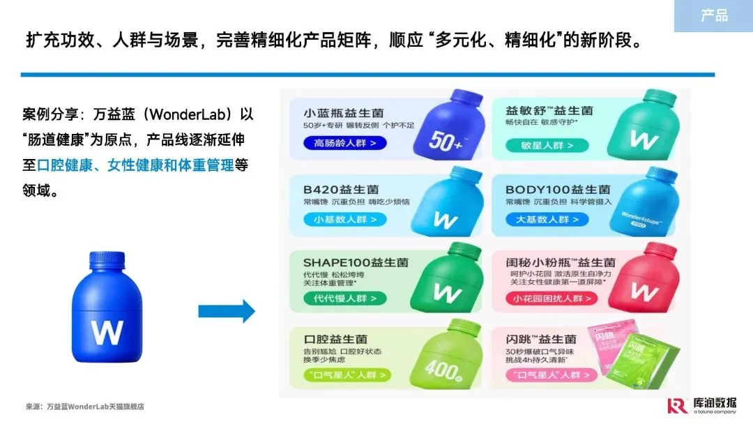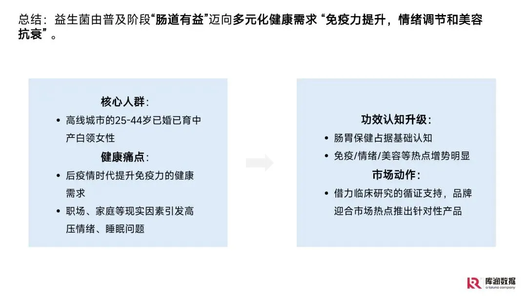 益生菌、核心人群(高线城市 25-44 岁已婚已育中产白领女性)、健康痛点(免疫力、睡眠、疲劳)、功效热点(免疫提升、情绪调节、美容抗衰)、市场格局(国际 + 本土品牌)、产品趋势(功效复合、形态多元、成分安全)、营销渠道(电商 + 社媒 + 直播)