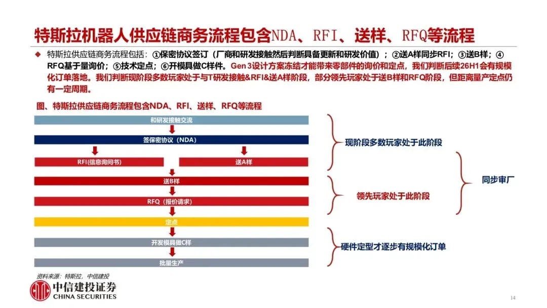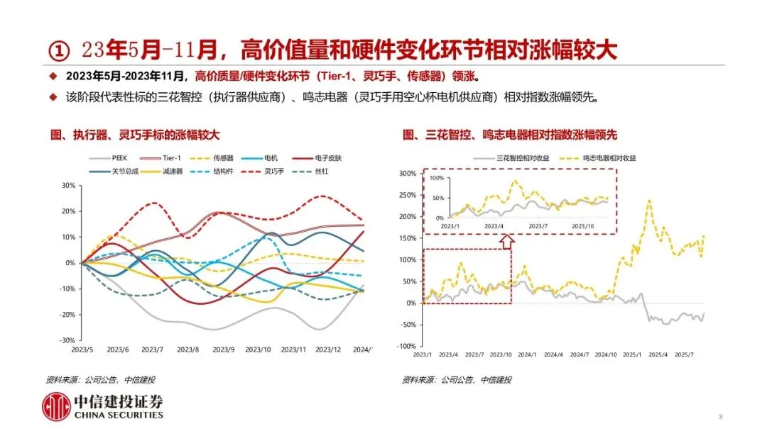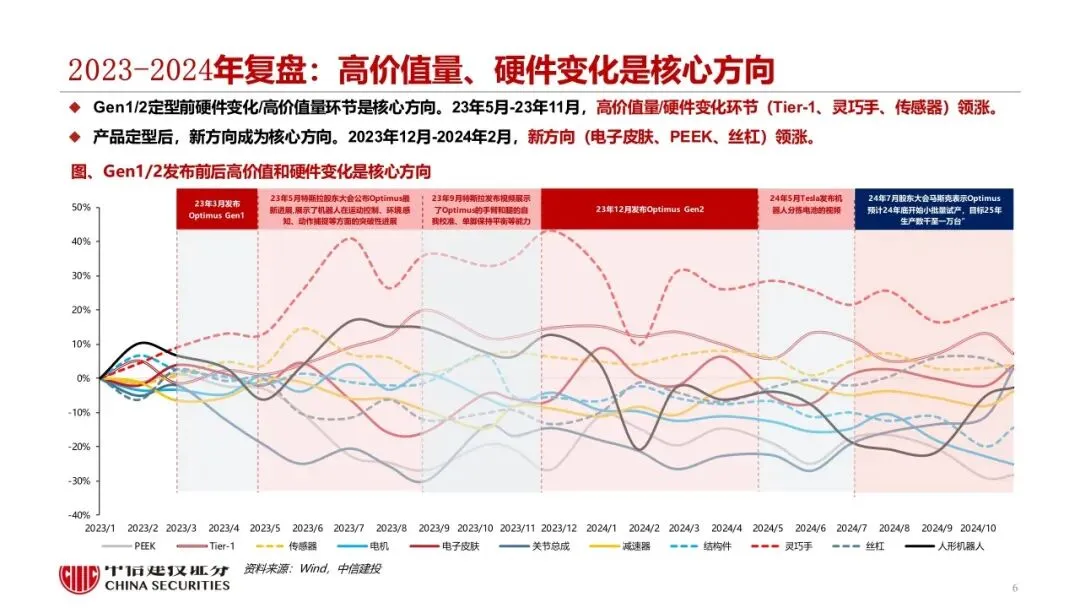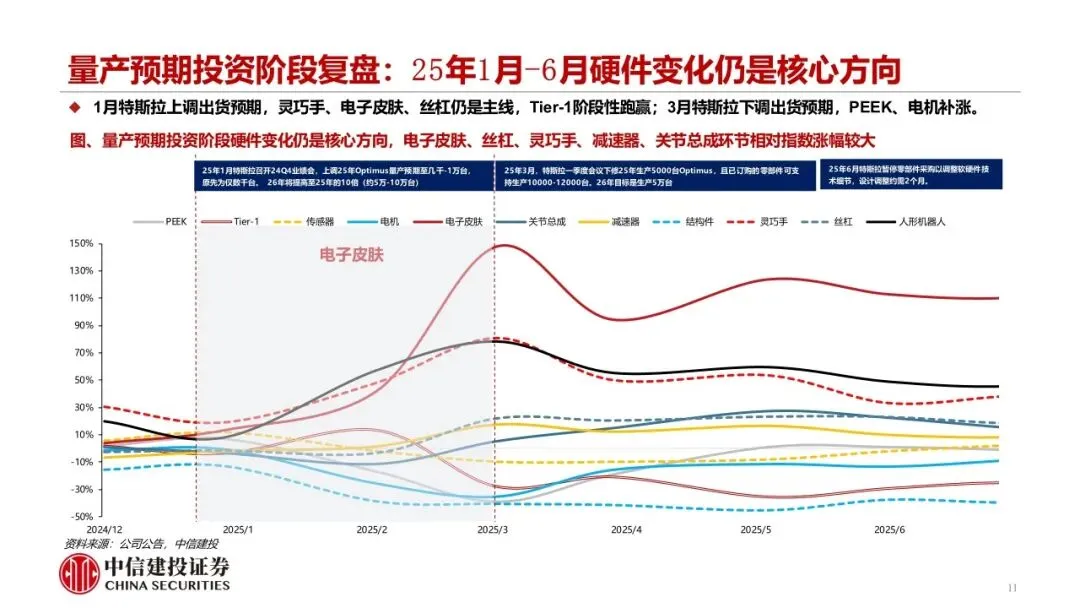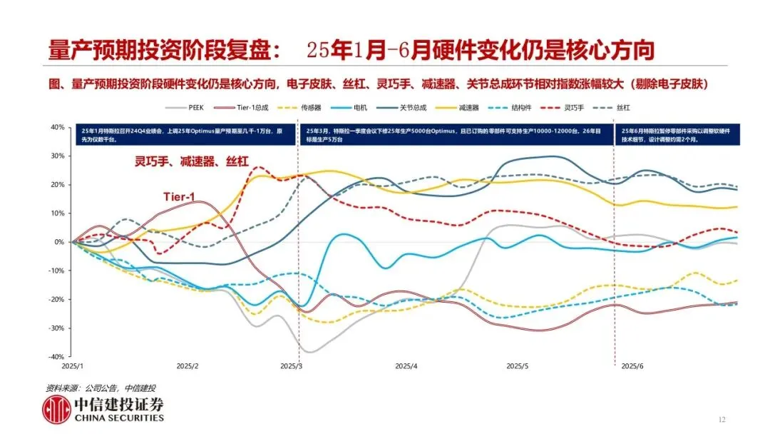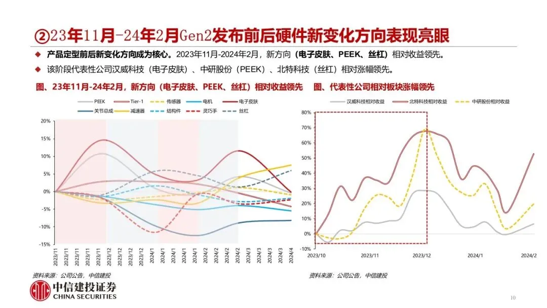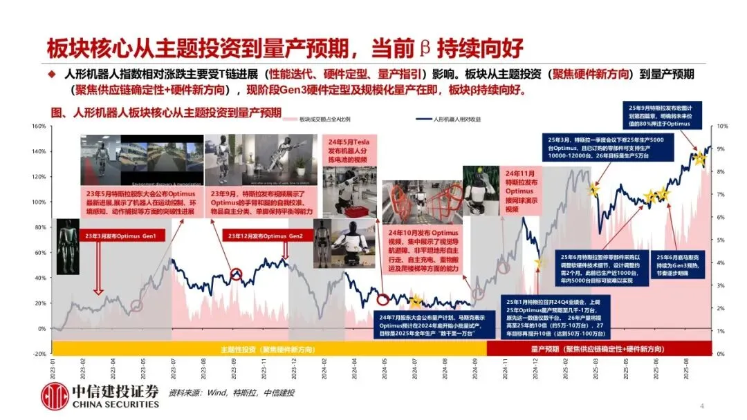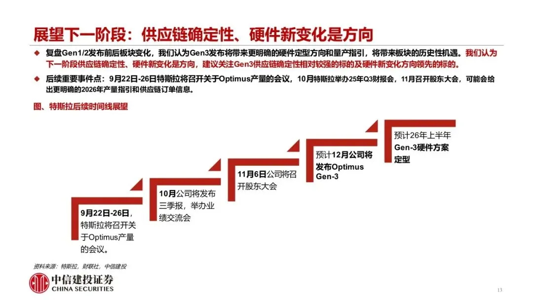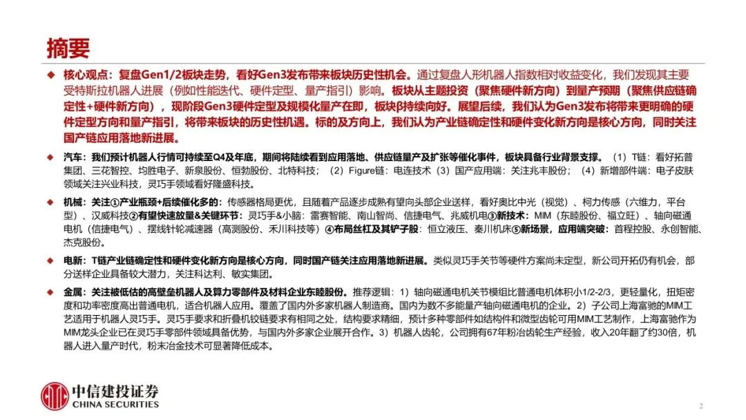 复盘Gen1/2板块走势,看好Gen3发布带来板块历史性机会。通过复盘人形机器人指数相对收益变化,我们发现其主要受特斯拉机器人进展(例如性能迭代、硬件定型、量产指引)影响。板块从主题投资(聚焦硬件新方向)到量产预期(聚焦供应链确定性+硬件新方向),现阶段Gen3硬件定型及规模化量产在即,板块β持续向好。展望后续,我们认为Gen3发布将带来更明确的硬件定型方向和量产指引,将带来板块的历史性机遇。标的及方向上,我们认为产业链确定性和硬件变化新方向是核心方向,同时关注国产链应用落地新进展。