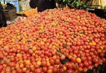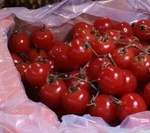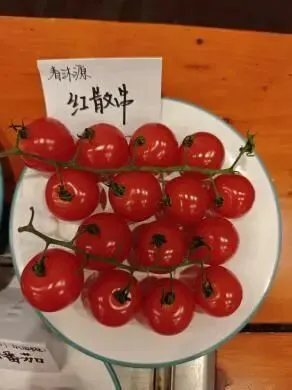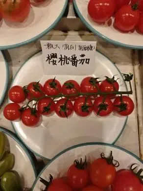 樱桃番茄:樱桃番茄色泽鲜红亮丽,圆润饱满,大小均匀,紧密排列在盘中,十分好看;汁水丰富,甜度较高,酸度较低,口感软糯细腻;可溶性糖含量为9.9%,价格为14.9元/斤。