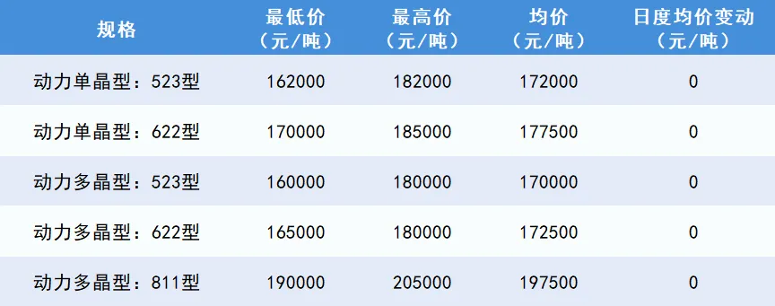 今日三元材料市场价格暂稳,三元材料企业多暂停对外报价,市场观望情绪较浓。下游多谨慎采买,散单成交较少,预计短期内三元市场价格持稳为主。