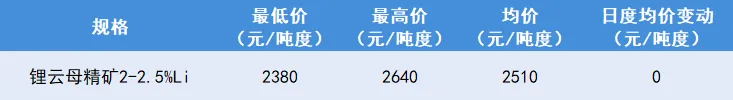 今日锂矿市场价格暂稳,下游谨慎采购观望,市场交投清淡,价格呈僵持弱平衡。
