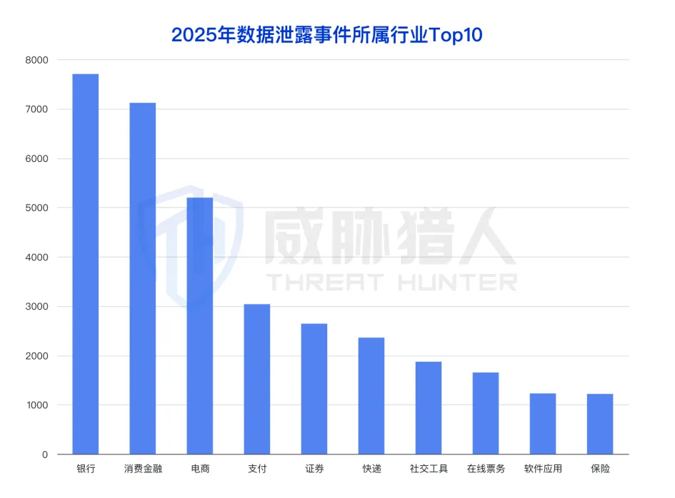 从行业分布看,银行业数据泄露风险呈现“断层式”领先。据威胁猎人监测,2025年数据泄露事件所属行业Top10中,银行业位居首位,消费金融行业反超电商行业跃升至第二位,支付与证券行业排名也显著前移。报告显示,黑产攻击重心已高度聚焦于具备高变现价值的信贷与资金流相关数据,金融类数据在非法交易中占比超过50%,反映出黑产对金融数据的强烈觊觎。