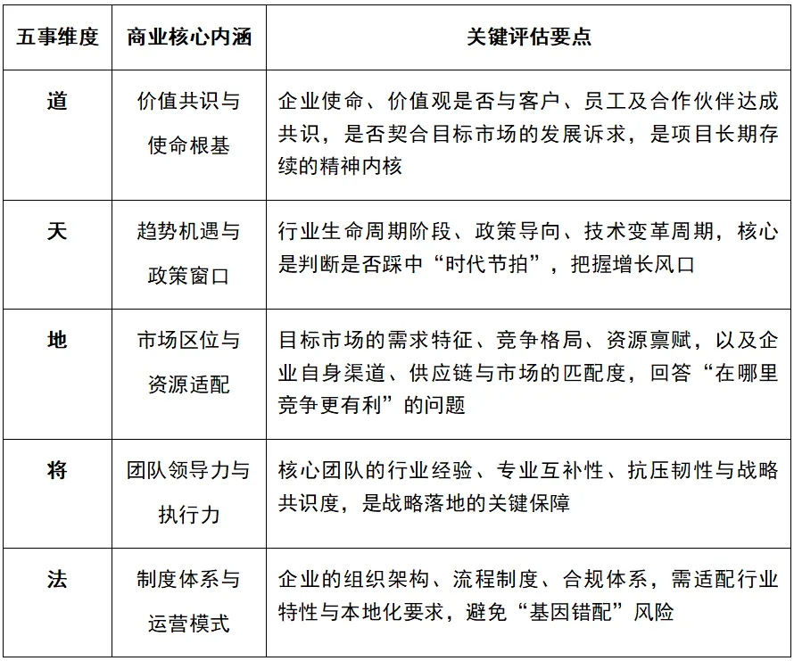 在“五事”框架中,“道”是统领全局的核心,决定项目的方向与初心;“天、地”是外部机遇窗口,决定项目的发展空间;“将、法”是内部执行能力,决定项目的落地效率。五者相辅相成,形成“趋势-机遇-定位-模式-执行”的商业分析闭环,最终实现“胜兵先胜而后求战”的目标。
