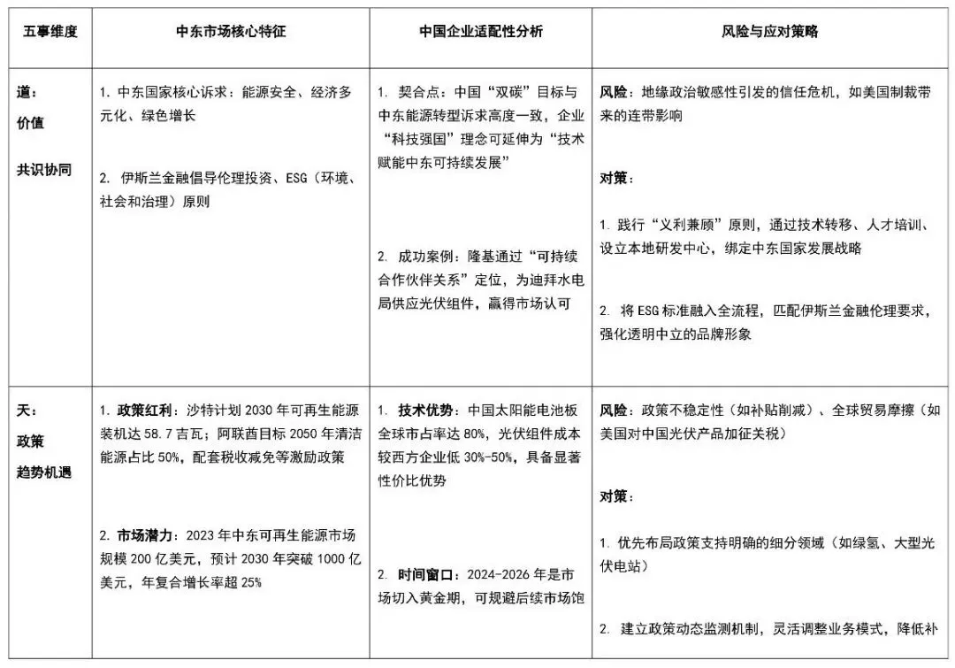 基于“五事”框架的分析,中国新能源企业拓展中东市场需把握以下关键策略: