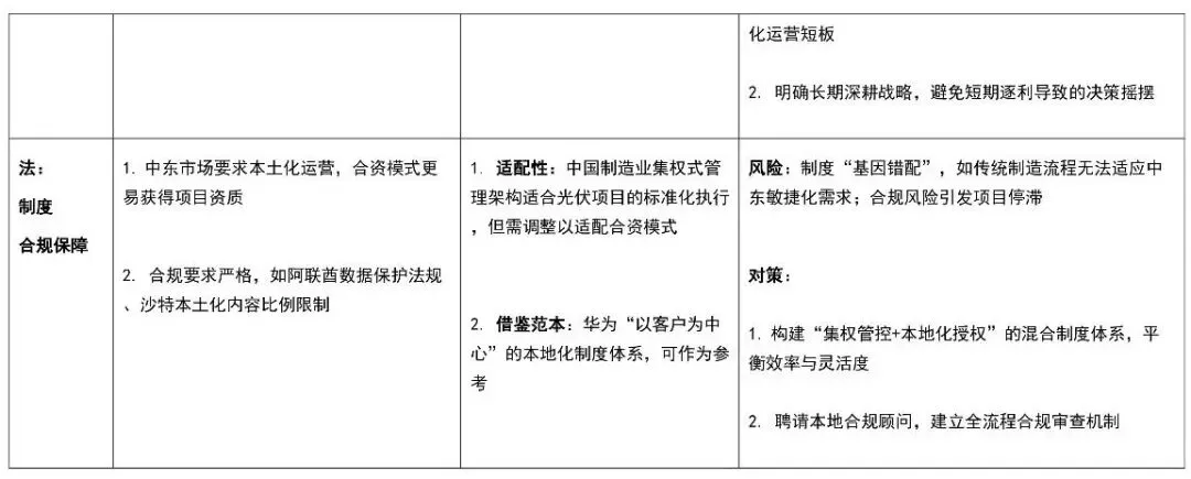 4. 强化“将法”能力,本土化运营:通过合资模式弥补团队跨文化能力短板,构建适配中东市场的制度体系,平衡效率与合规要求。