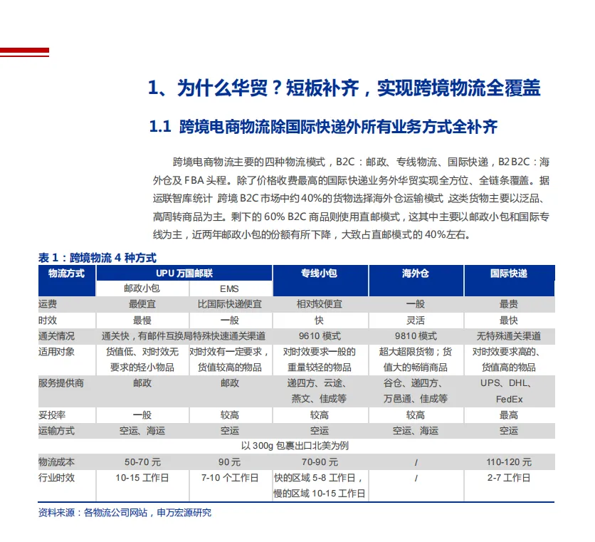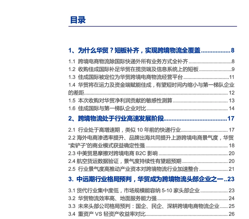 核心亮点集中在三大维度。一是行业高增红利,跨境电商市场持续扩容,2019 年交易规模达 10.5 万亿元,物流作为核心配套,呈现类似十年前快递行业的高增长态势。二是华贸战略补强,通过收购佳成国际,补齐揽货端与信息系统短板,实现邮政小包、专线、海外仓等全链路覆盖,服务从大 B 延伸至中小卖家。三是竞争优势凸显,依托国企背景的运力与资金优势,叠加佳成的海外仓与清关能力,协同效应显著,有望缩小与行业第一梯队差距。