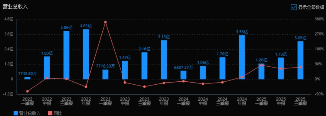 营业总收入:2025年三季度的营业总收入为3.05亿元,相较于2024年三季度的1.76亿元,增长了72.72%。评价:营收规模显著提升,增速较高,显示公司业务扩张或市场回暖的积极信号。