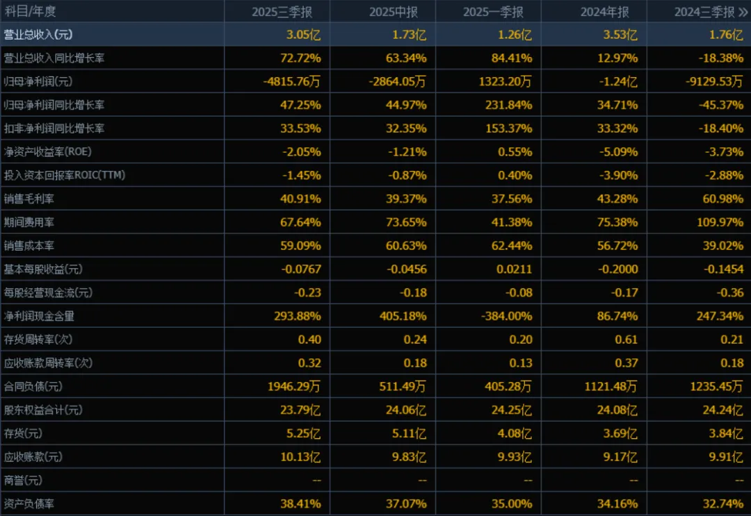 综上所述:该公司在2025年三季度展现出营收快速增长、亏损收窄、费用控制成效显著、现金流质量提升等积极变化。然而,毛利率下滑、成本率上升、存货与应收账款规模较大、资产周转效率偏低等问题仍较突出。整体来看,公司正处于业务扩张与盈利修复阶段,但需在成本控制、运营效率提升和资产结构优化方面持续加强,以实现可持续盈利。