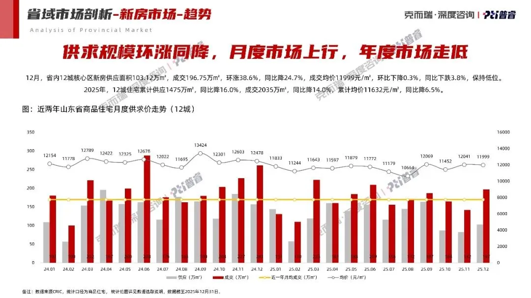 市场端:2025年,省内12城住宅累计供应1475万㎡,同比降16.0%,成交2035万㎡,同比降14.0%,累计均价11632元/㎡,同比降6.5%。