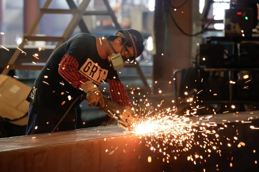 工人在加工车间焊接钢材。(资料图)赵明 全媒体记者 翁艳 摄