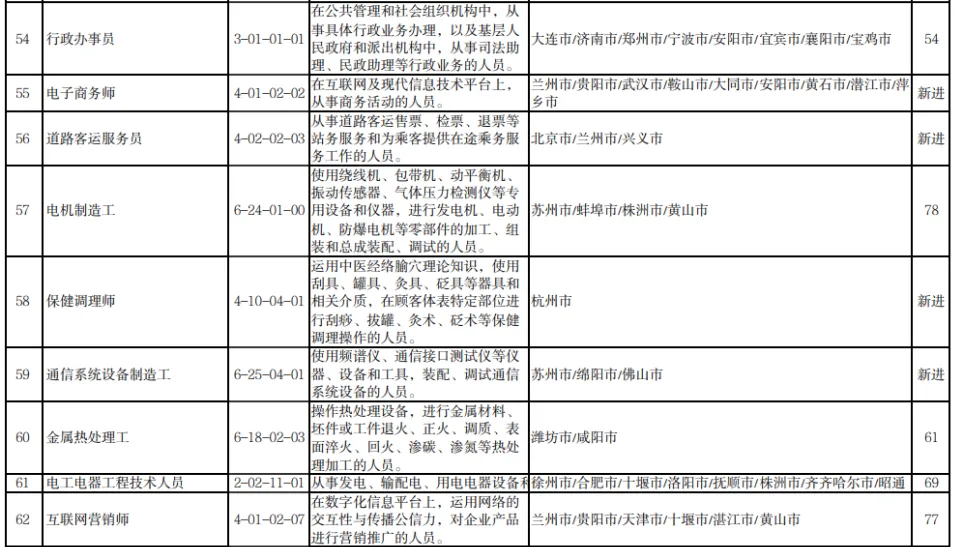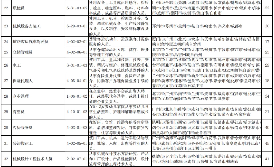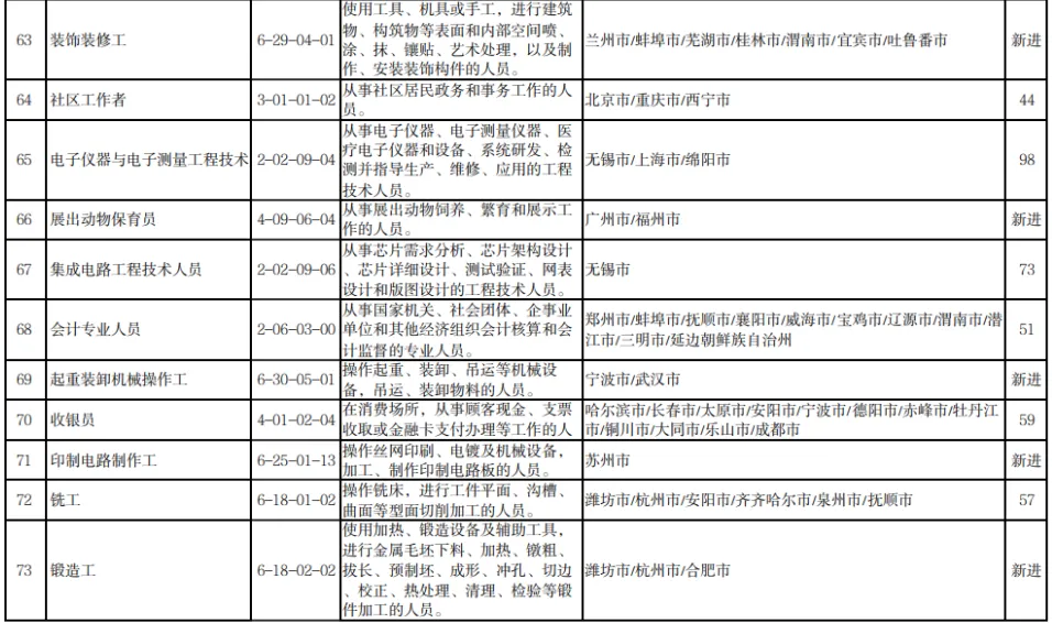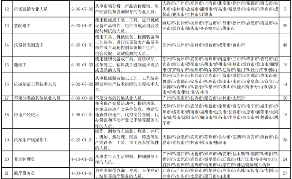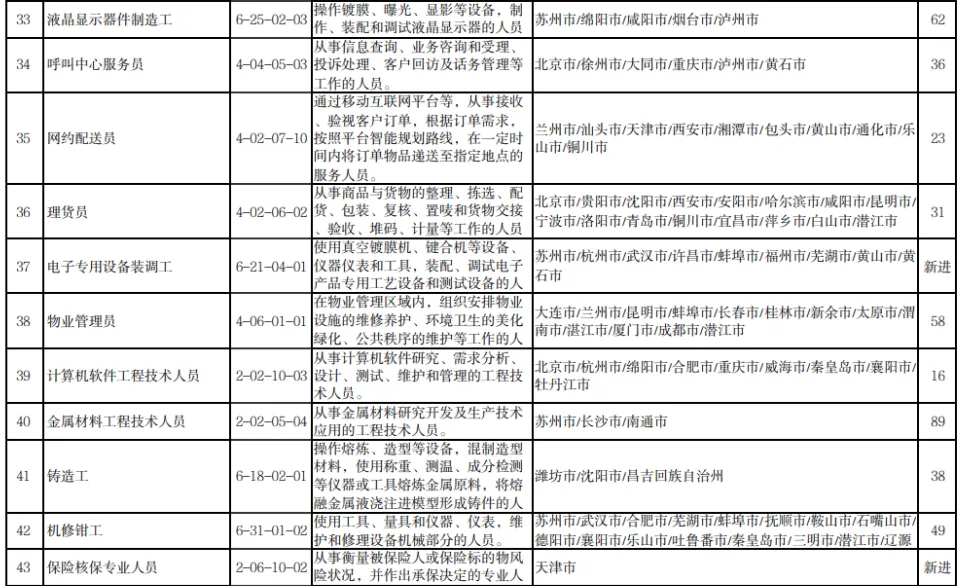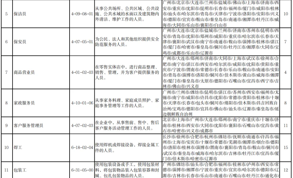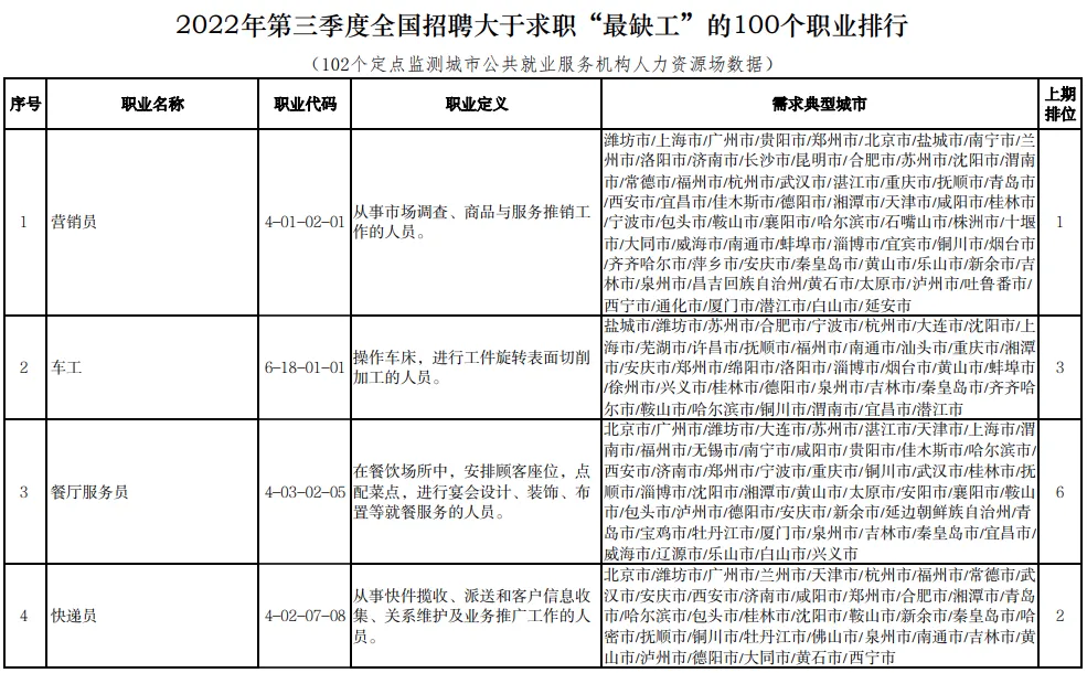11月1日,人力资源和社会保障部发布2022年三季度全国“最缺工”的100个职业排行。其中,营销员、车工、餐厅服务员、快递员、保洁员、保安员、商品营业员、家政服务员、客户服务管理员、焊工等职业位列前十。