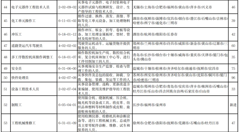 报告显示,与2022年二季度相比,制造业缺工状况持续,技术工种岗位缺工较为突出。铆工、锻造工、模具工等职业新进“最缺工”100个职业排行,车工、焊工位列排行前十,电机制造工、仪器仪表制造工、汽车生产线操作工等缺工程度较二季度有所增加;物流及运输行业缺工程度有所增加,邮政营业员、道路客运服务员新进排行,快件处理员、道路货运汽车驾驶员、装卸搬运工等职业缺工程度加大。