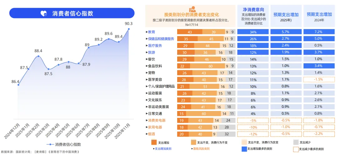 同年11月消费者信心指数回升至90.3,但仍低于历史均值,折射出谨慎与乐观并存的市场情绪现状。在此背景下,中国消费市场呈现显著的结构性分化:一方面,居民对健康保健与教育提升等实用性消费以及旅游休闲等体验性服务消费需求持续旺盛;另一方面,家电、非必需服饰及烟酒等传统品类增长相对乏力。这种此消彼长的态势,清晰展现了消费重心正从物质拥有转向生活品质与内在价值的全面提升。