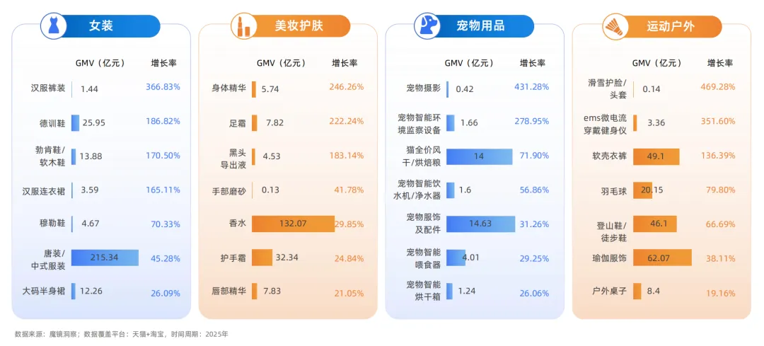 消费市场的演进脉络清晰勾勒出当代生活的价值转向,并催生出具有鲜明特征的品类机遇。随着本土文化与舒适主义风潮的兴起,汉服与德训鞋等高增长品类正成为生活方式的具象表达。与此同时,“悦己主义”及“科学消费”思潮也推动美妆个护品类朝精细化、功效化演进,其中以身体精华、足霜等个护细分品类表现尤为突出。户外运动领域则围绕“兴趣圈层”持续升温,带动冰雪、登山、露营等细分场景专业品类装备显著增长。此外,宠物经济在延续高热度的同时,亦呈现出智能化、拟人化与精细化的演进特征,映射出情感陪伴与科技融合的消费新动向。