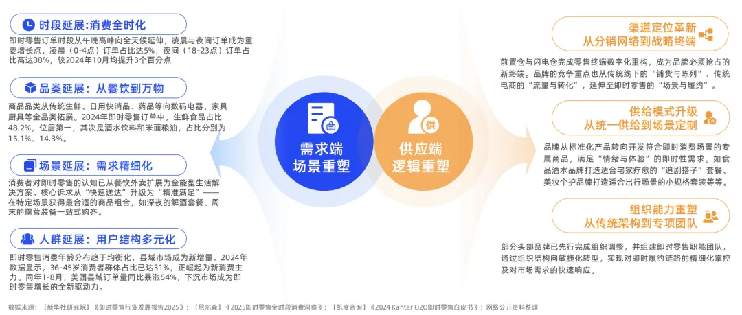 即时零售的本质,是从计划性商品交付向全时段服务响应的渠道能力升维。这一新兴业态通过构建确定性履约网络,将品牌服务嵌入用户碎片化生活场景,进而延伸服务半径、激活本地供给,创造出“即想即得”的消费新范式。在消费端需求升级与供给端能力革新的浪潮下,2025年即时零售呈现出全新的清晰脉络:在需求端,是全时段、全品类、全场景、全人群的全面渗透;在供给端,是“仓店”新终端的崛起和供给模式的转向升级。未来的竞争,将超越单纯的履约效率,进入供应链深度、生态协同与用户体验综合性角逐的新阶段。
