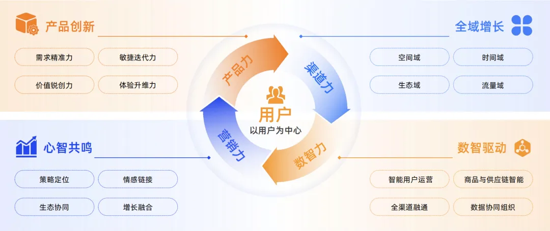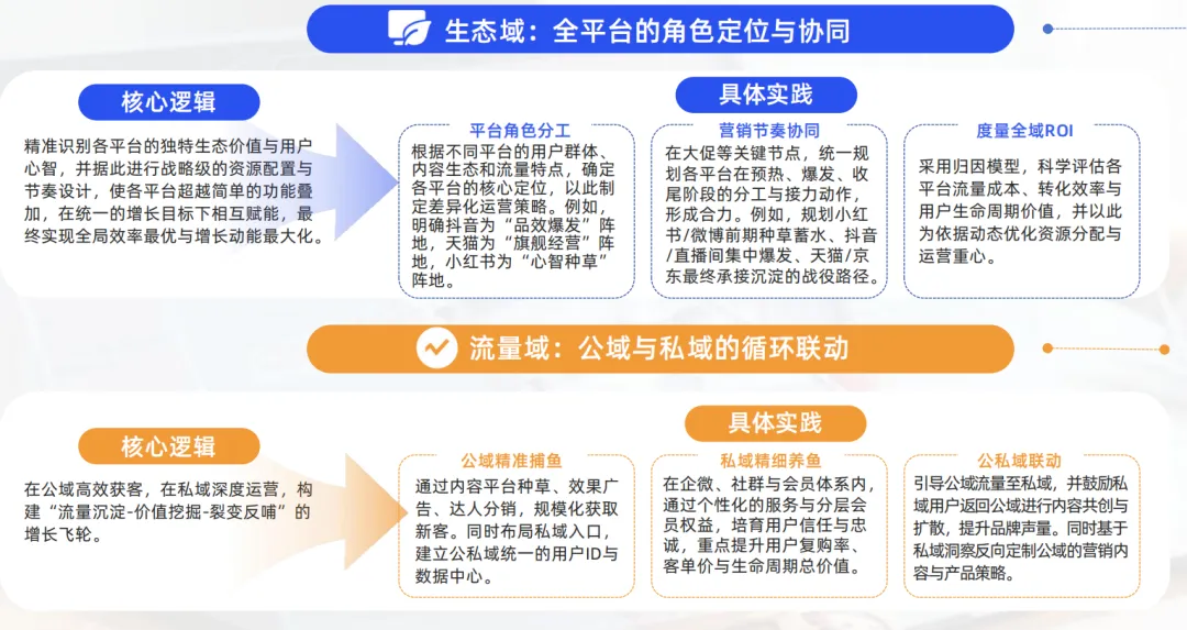 渠道力反映品牌对销售通路的掌控力与适配性,不仅关乎覆盖广度,更强调在不同渠道生态中的运营深度与协同效率。其目标是在多端触达中实现体验一致性与履约效率最大化。为此,品牌需在两大关键领域深化布局:一是平台生态的协同运营,即根据各平台特性进行战略分工与营销节奏协同,并以科学的全域效果评估优化资源配置;二是公私域的用户循环运营,核心是打通从公域获客到私域培育的闭环,通过精细化服务与激励分享,构建能够自我造血、持续反哺的增长体系。