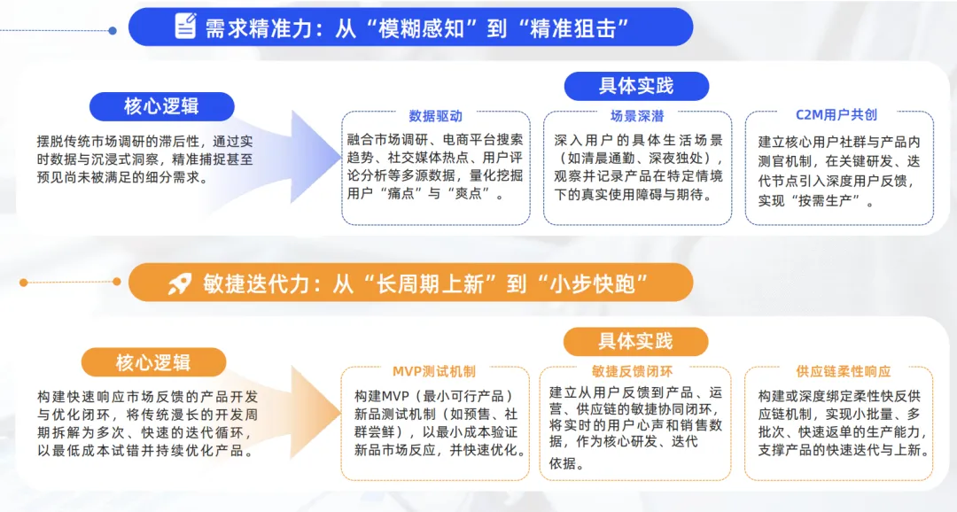 产品力是品牌长期价值的根基,体现为持续提供满足甚至超越用户期待的解决方案的能力。在新消费语境下,产品不仅是功能载体,更是品牌价值观与用户体验的具象化表达。在信息过载与需求快速迭代的市场中,坚实的产品力尤其依赖于两种核心能力的共建:一是前瞻性的洞察与定义能力,即能深入数据与场景,精准捕捉并将潜在需求转化为清晰的产品蓝图;二是敏捷的验证与进化能力,即能建立快速反馈闭环,驱动产品在市场真实反馈中持续迭代与优化。