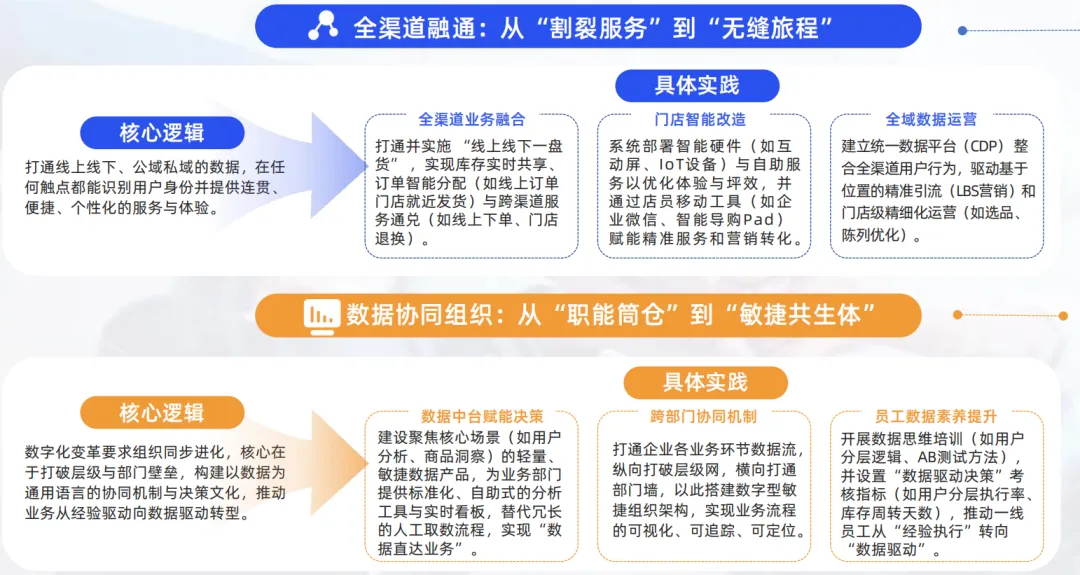 零售数字化的深度实践,正系统性重塑着品牌的“前台”与“后台”。在前台,通过对销售场域进行数字化改造与融合,打通数据、库存与服务,将线上线下离散的触点整合为体验一致、履约高效的智能网络。在后台,则是对组织本身进行以数据为核心的协同能力重塑,关键是通过工具赋能、流程重构与文化培育,构建能够支撑前台敏捷运行与持续创新的决策与行动体系。
