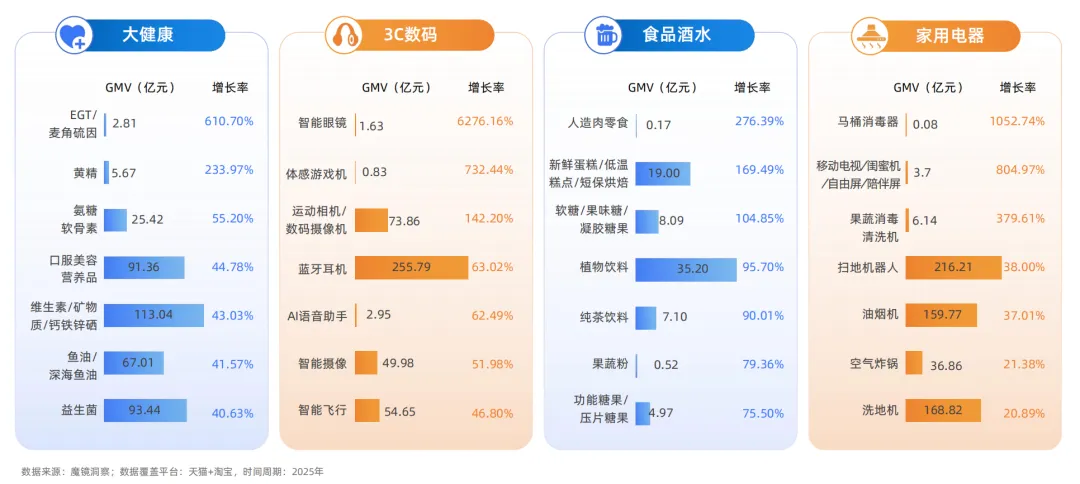健康消费理念持续深化,从口服营养品、植物基食品,进一步延伸至果蔬消毒机、马桶消毒器等外部环境干预,呈现出主动管理、精细渗透的日常化趋势。与此同时,在AI技术革新驱动下,沉浸化体验与个性化创作需求正重塑3C数码消费,推动智能眼镜及智能摄像设备耗材进入高景气增长周期。而在家庭场景中,对省力便捷与情感陪伴的双重追求,则共同带动了扫地机器人、洗地机以及移动陪伴屏等品类的快速发展。这标志着消费决策的核心,已从基础功能满足全面转向对身心健康、深度体验及便捷生活的系统性价值投资。