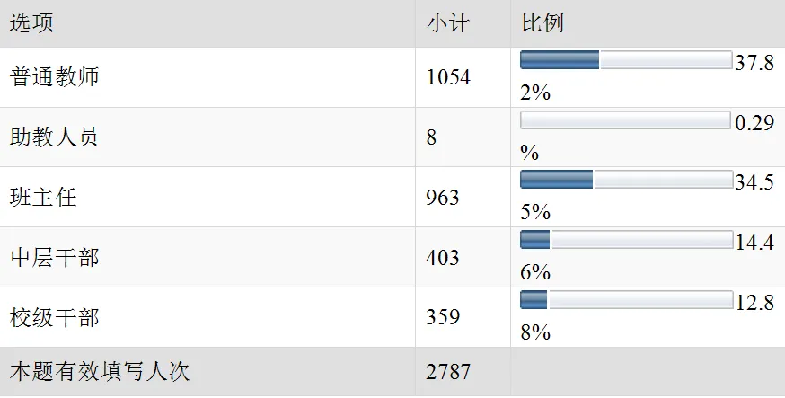 通过问卷数据显示,普通教师和班主任是反应最大的群体,分别占比37.8%和34.5%;其次还有不少的中层干部或校级干部也有表示。