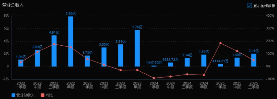 2025年三季度的营业总收入为2.01亿元,相较于2024年三季度的1.34亿元,增长率为49.84%。评价:收入规模显著提升,表明公司业务在2025年呈现较强的复苏态势,营收增长明显。
