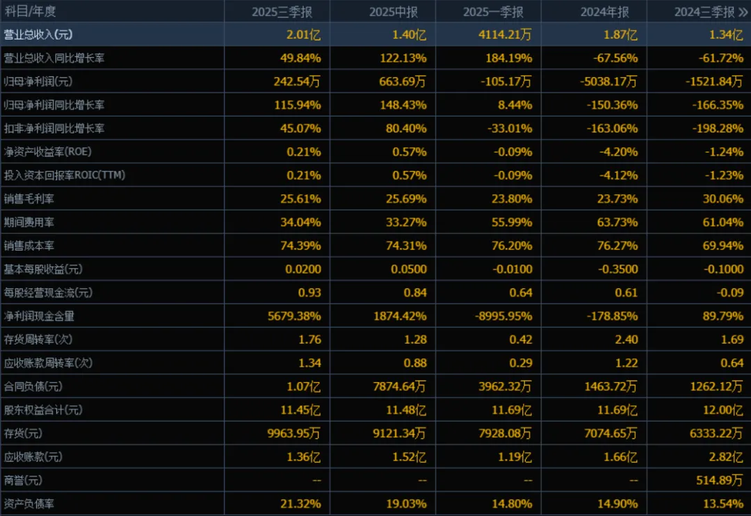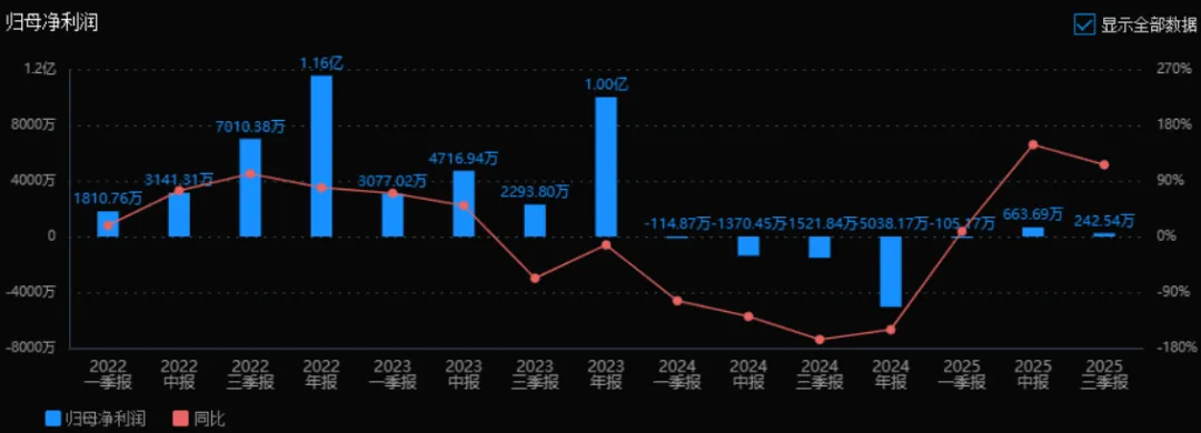 2025年三季度的归母净利润为242.54万元,相较于2024年三季度的-1521.84万元,实现了扭亏为盈,同比增长率为115.94%。评价:净利润由负转正,表明公司盈利能力有所改善,经营效益逐步提升。