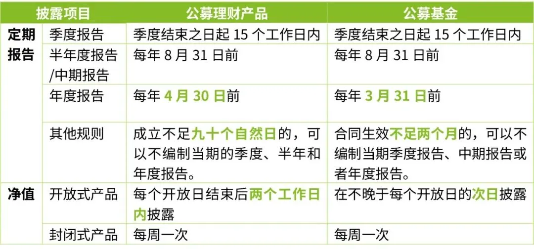 《办法》第十五条与第十九条分别明确了产品定期报告及产品净值的披露时限。公募理财产品在定期报告及净值披露方面的时间要求基本与公募基金看齐,个别标准略低于公募基金,具体对比如下: