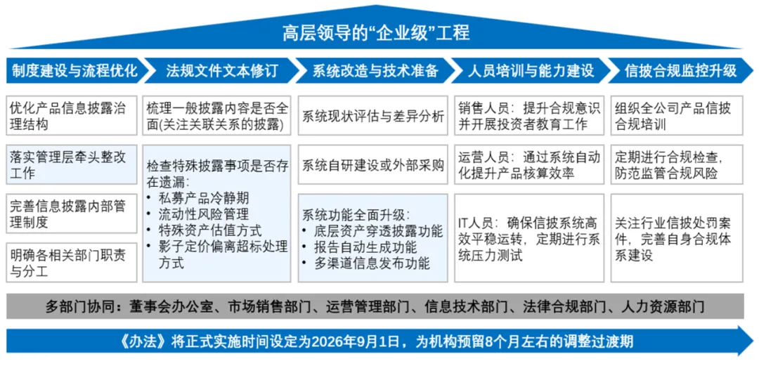 对于理财机构而言,落实《办法》远非简单的合规调整,而是一项涉及运营、系统和文化的“企业级”系统性工程。此项工程要求理财机构进行跨部门的协同整合,从公司治理、流程再造、技术升级到合规能力建设等方面实现全面优化,以将信息披露的规范性和有效性深度融入业务全流程。