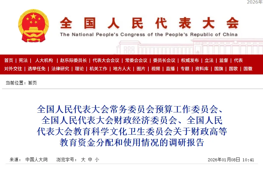 近日,一份由全国人大常委会三个专门委员会联合发布的调研报告,将我国高等教育财政投入的全景图清晰地呈现出来。这份发布于2026年1月8日的报告显示,2021至2024年,财政性经费占全国高等教育总投入的61.2%,成为绝对主体。我国已建成世界上规模最大的高等教育体系,2024年毛入学率60.8%,拥有大学文化程度人口超过2.4亿人。然而,在这些宏观成就背后,一系列问题正悄然显现——资源分布不均、经费来源单一、资金资产管理粗放。这些问题直接关系到我国能否从高等教育大国迈向高等教育强国。01 投入态势